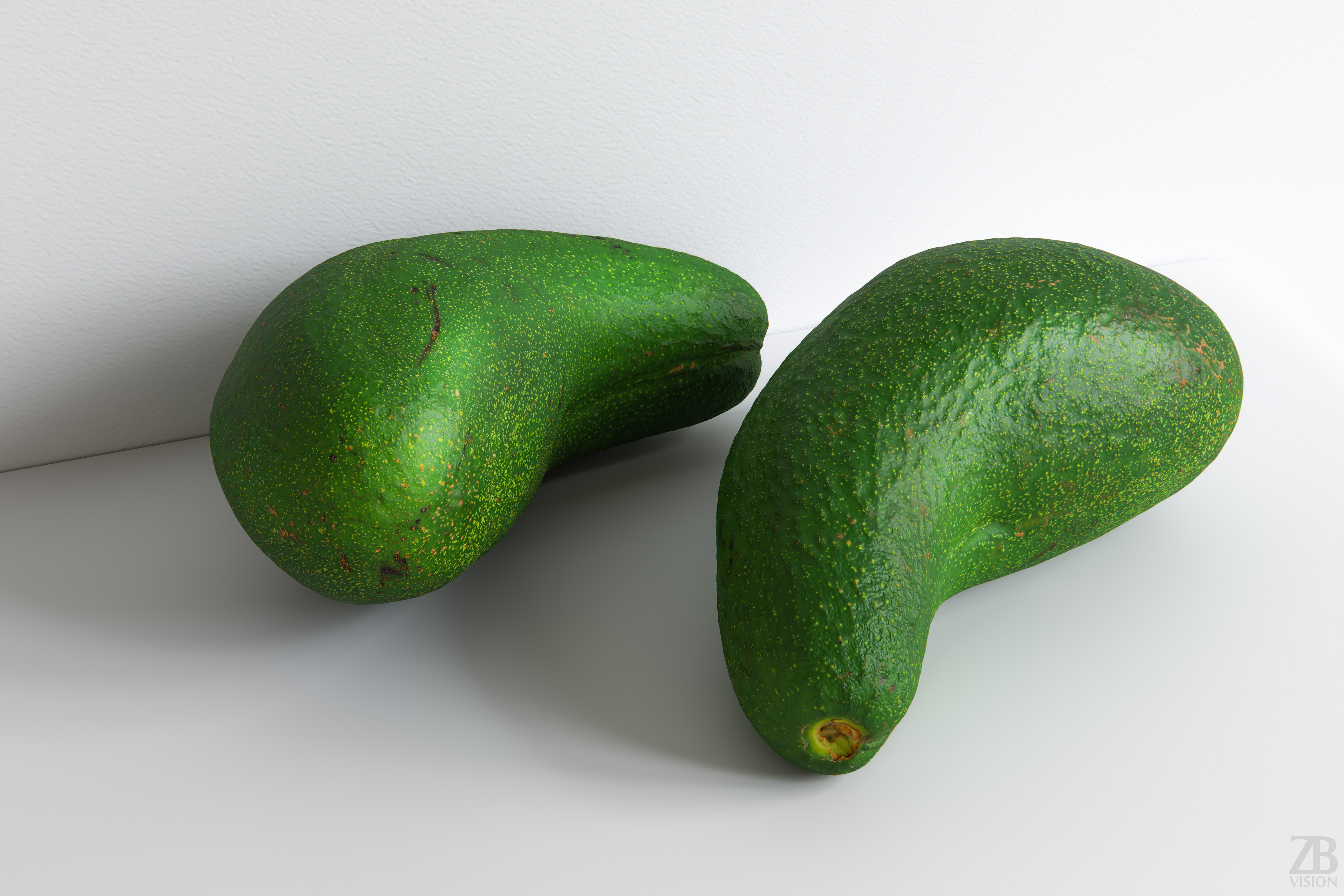 The avocado model is presented as single mesh in 2 versions: low and high. Mesh is quad based. Base low model polycount is 1152. High detail model included in .max, .fbx, .c4d, .stl and .obj formats. High detail model has 1179k quads. The raw scan mesh of about 2 mil triangles is also provided in .obj format.