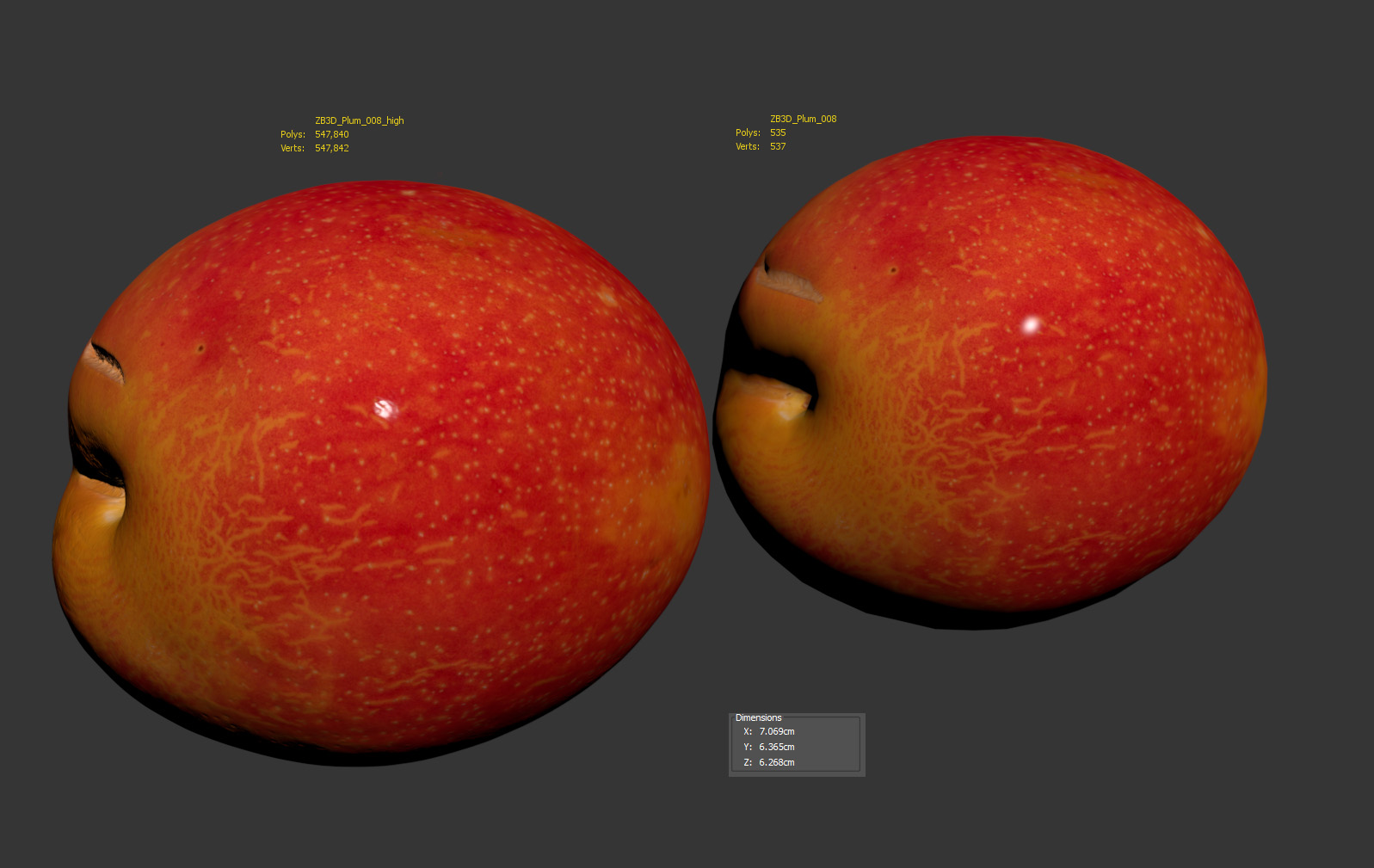 The plum model is presented as single mesh in 2 versions: low and high. Mesh is quad based. Base low model polycount is 535. High detail model included in .max, .fbx, .c4d, .stl and .obj formats. High detail model has 547k quads.The raw scan mesh of about 5.7 mil triangles is also provided in .obj format.