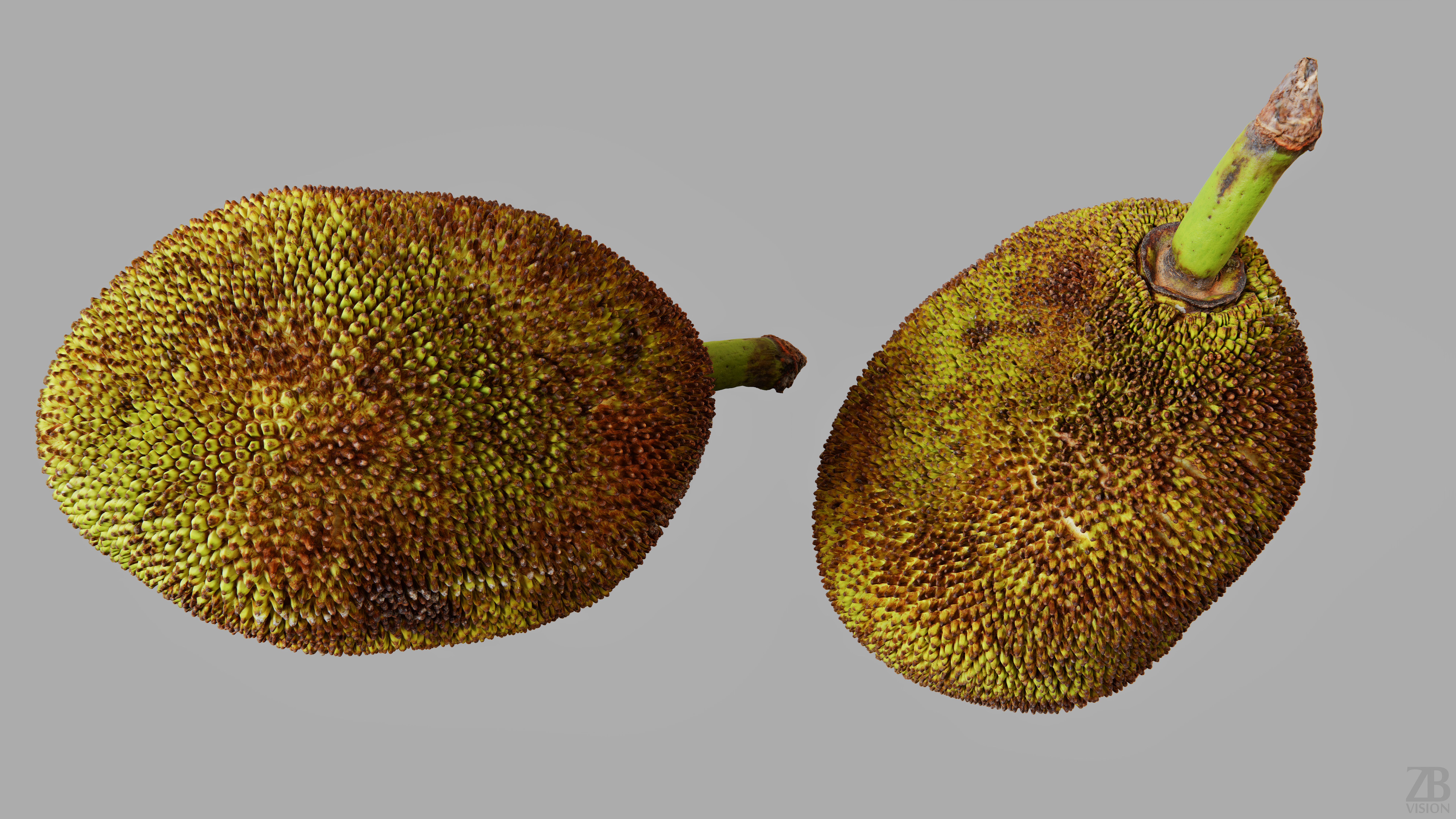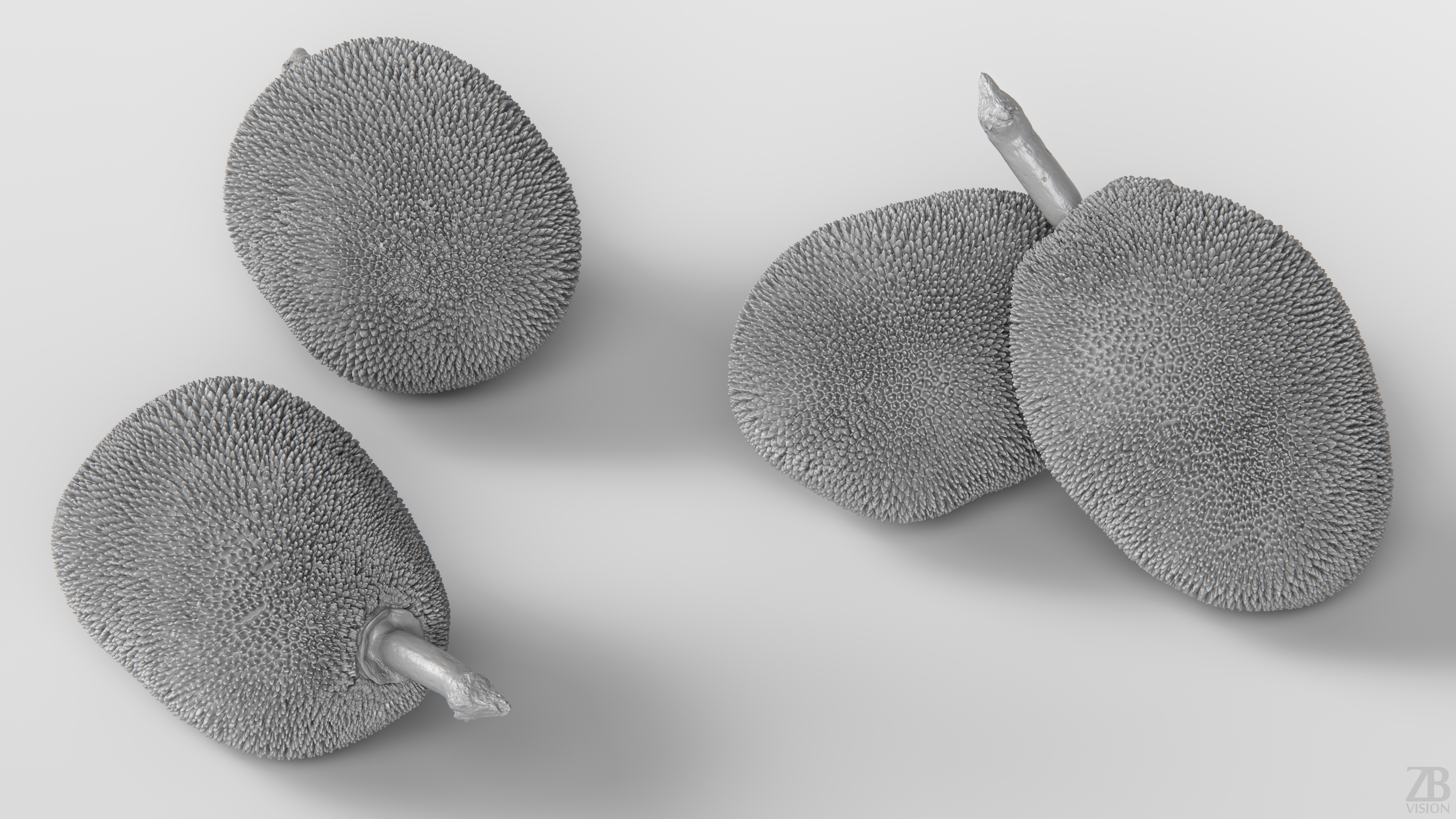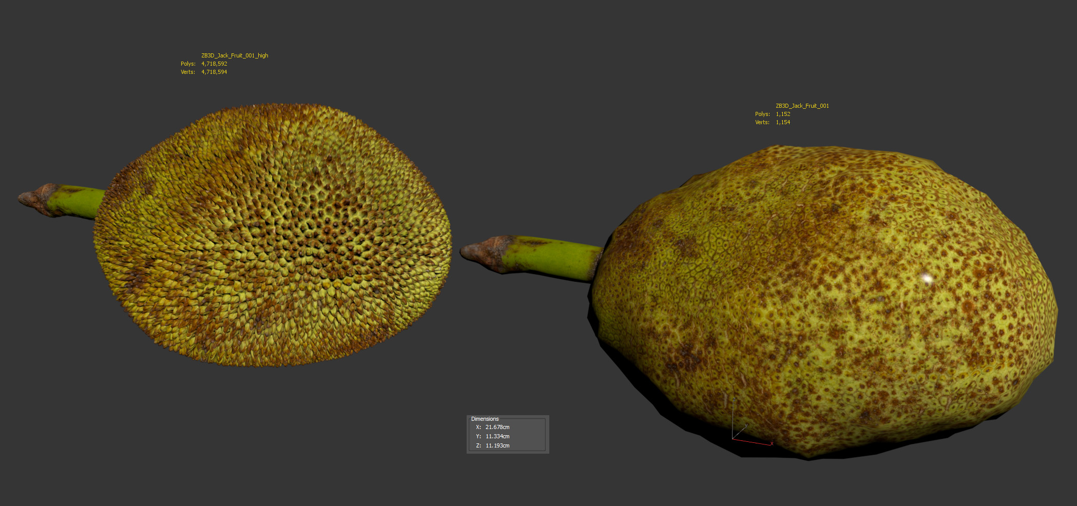 The jackfruit model is presented as single mesh in 2 versions: low and high. Mesh is quad based. Base low model polycount is 1152. High detail model included in .max, .fbx, .c4d, .stl and .obj formats. High detail model has 4718k quads. The raw scan mesh of about 39 mil triangles is also provided in .obj format.
