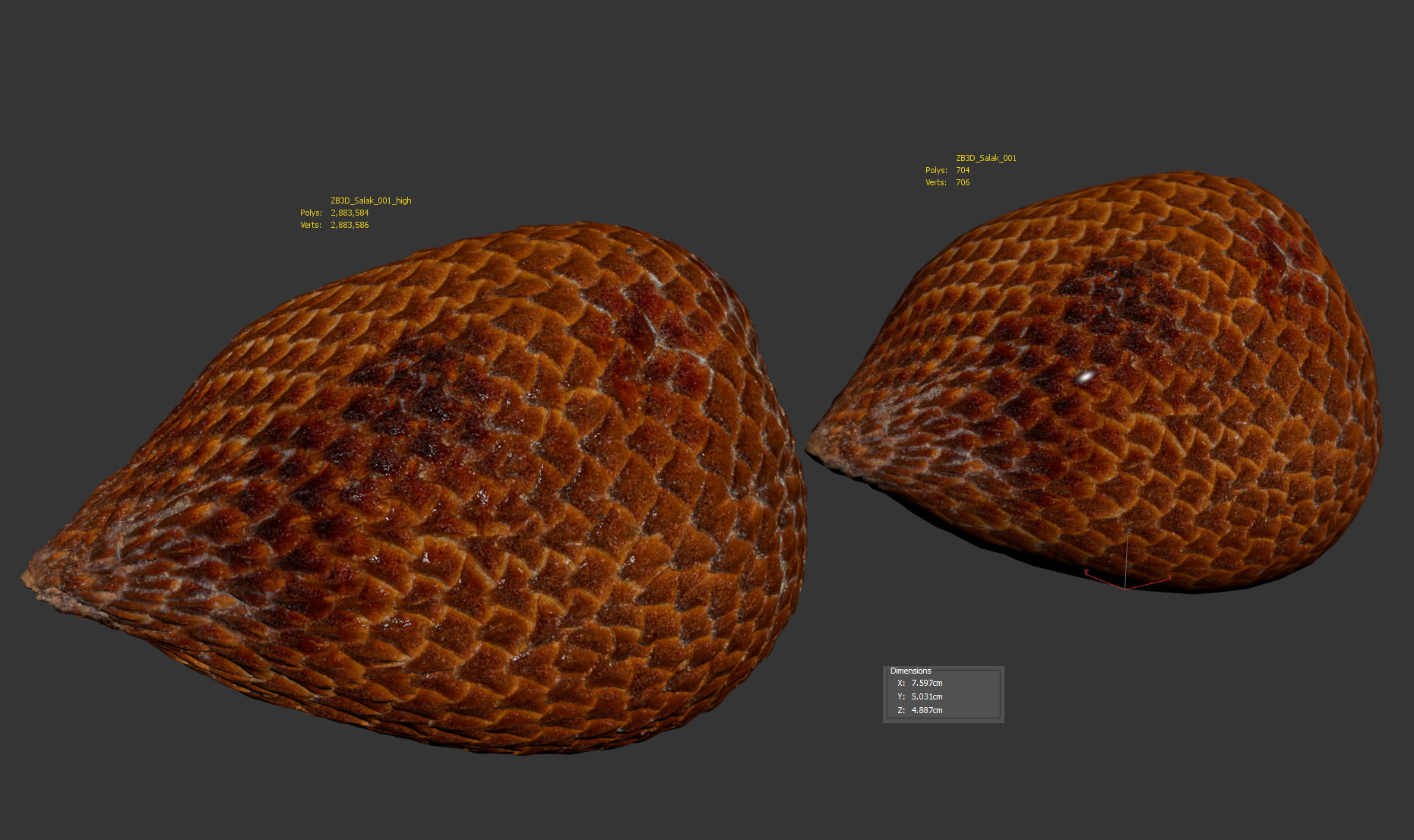 The salak model is presented as single mesh in 2 versions: low and high. Mesh is quad based. Base low model polycount is 704. High detail model included in .max, .fbx, .c4d, .stl and .obj formats. High detail model has 2883k quads. The raw scan mesh is also provided in .obj format.