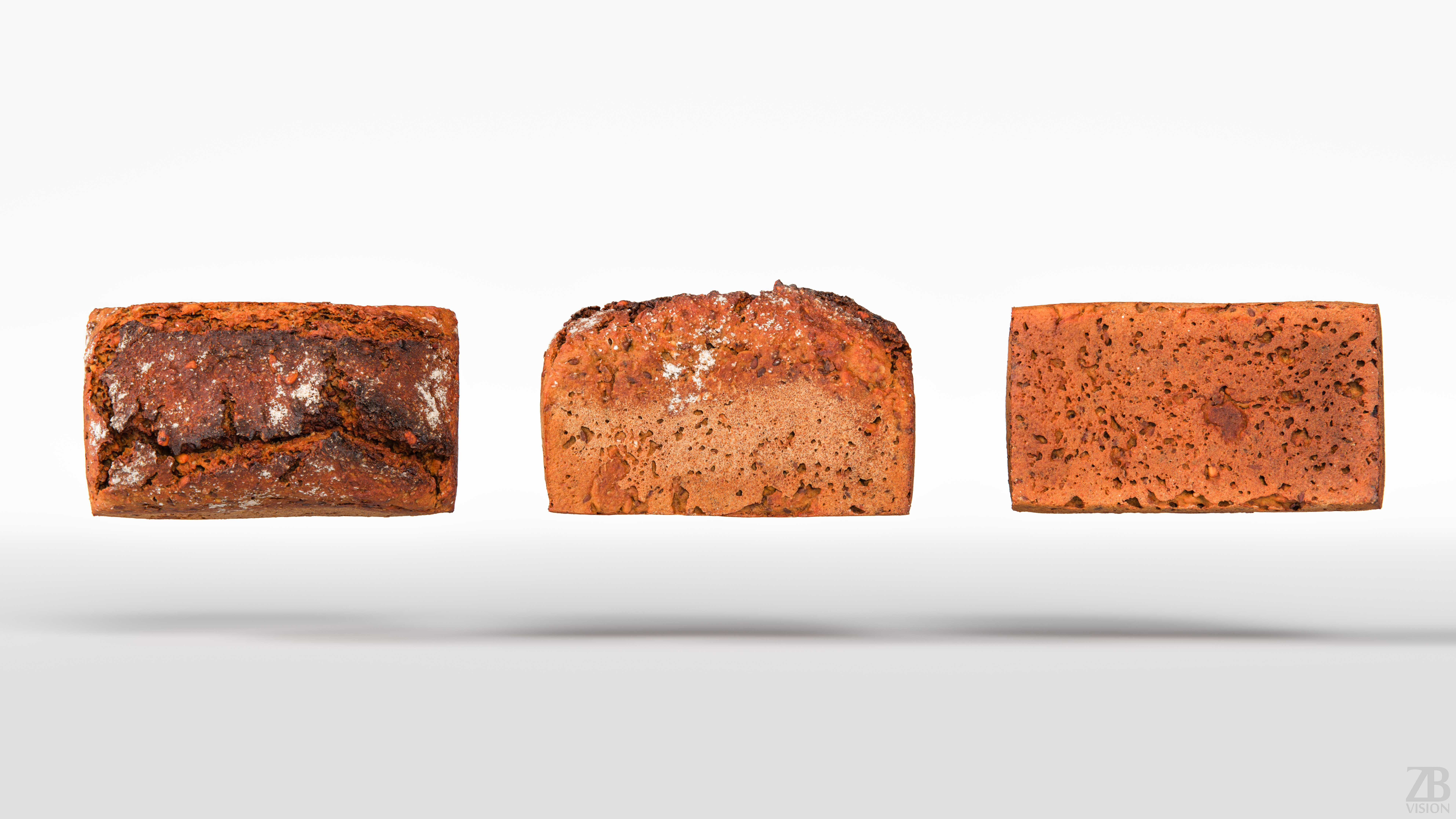 The bread model is presented as single mesh in 2 versions: low and high. Mesh is quad based. Base low model polycount is 2560. High detail model included in .max, .fbx, .c4d, .stl and .obj formats. High detail model has 2621k quads. Raw scan mesh is also provided in .obj format.