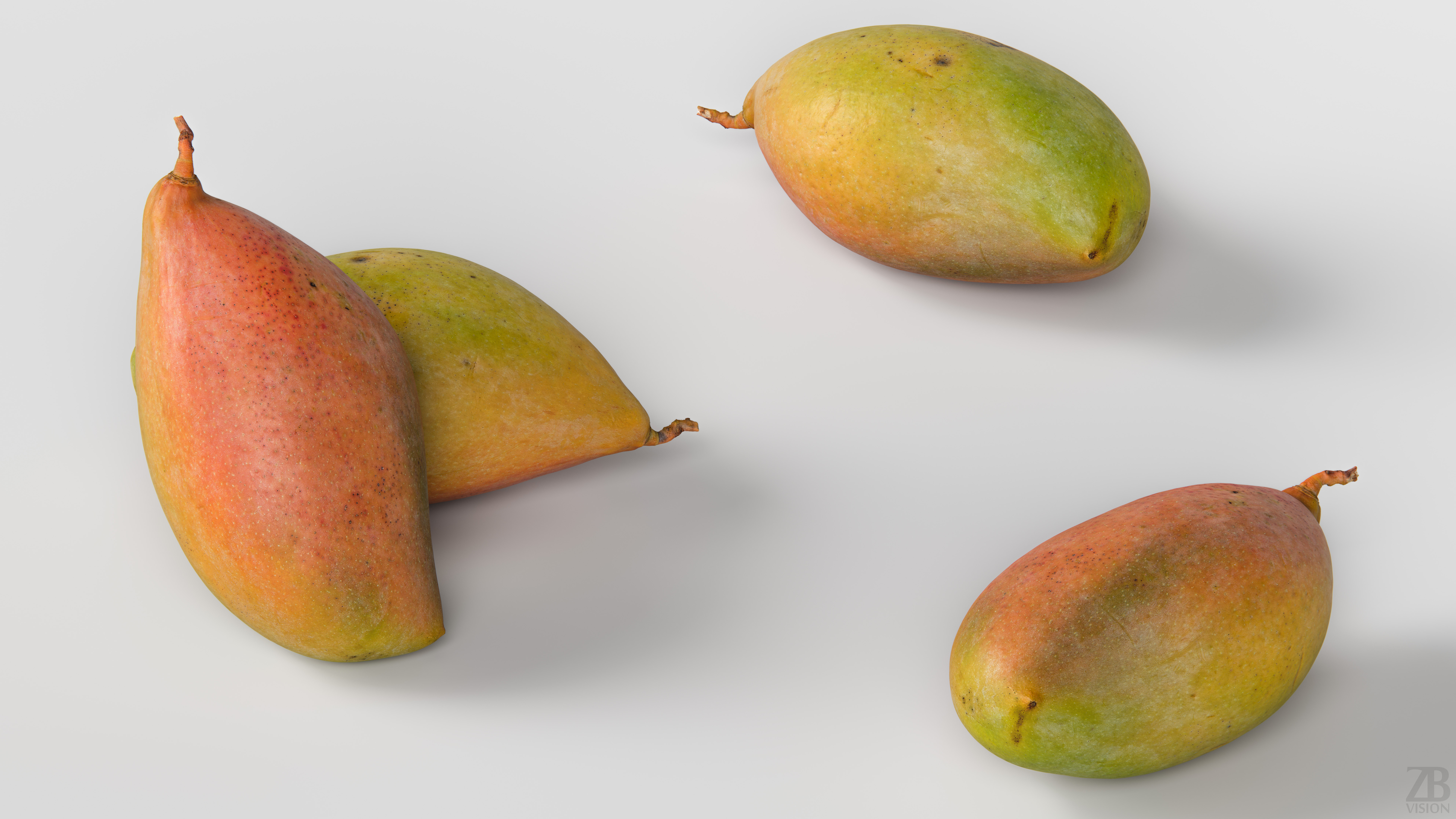 The mango model is presented as single mesh in 2 versions: low and high. Mesh is quad based. Base low model polycount is 512. High detail model included in .max, .fbx, .c4d, .stl and .obj formats. High detail model has 524k quads. Raw scan mesh is provided in .obj format.