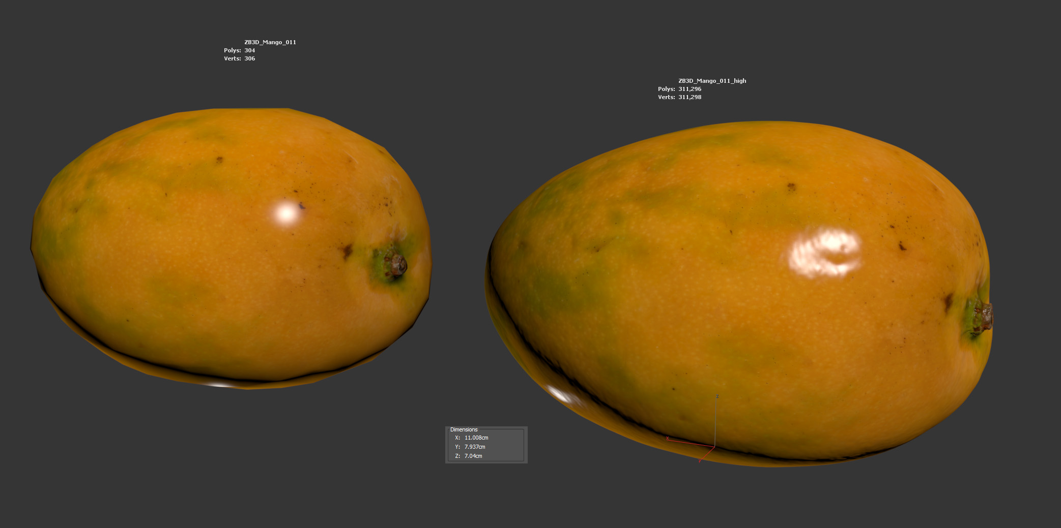 The mango model is presented as single mesh in 2 versions: low and high. Mesh is quad based. Base low model polycount is 304. High detail model included in .max, .fbx, .c4d, .stl and .obj formats. High detail model has 311k quads.