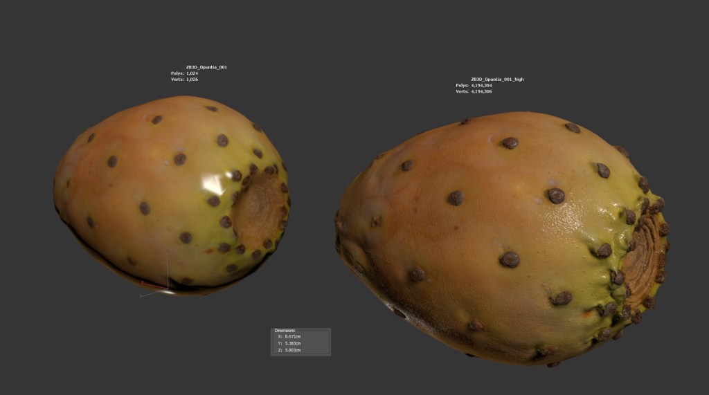 The opuntia model is presented as single mesh in 2 versions: low and high. Mesh is quad based. Base low model polycount is 1024. High detail model included in .max, .fbx, .c4d, .stl and .obj formats. High detail model has 4194k quads. Raw scan mesh is also included in .obj format.