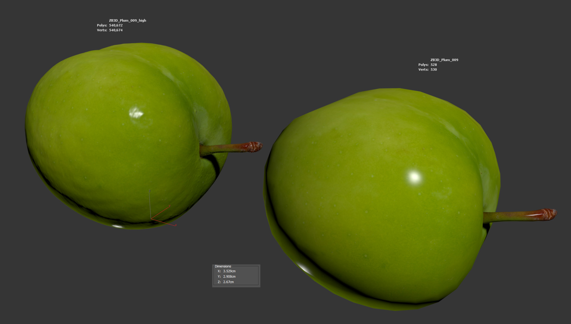 The plum model is presented as single mesh in 2 versions: low and high. Mesh is quad based. Base low model polycount is 528. High detail model included in .max, .fbx, .c4d, .stl and .obj formats. High detail model has 540k quads. Raw scan mesh is also included in .obj format.