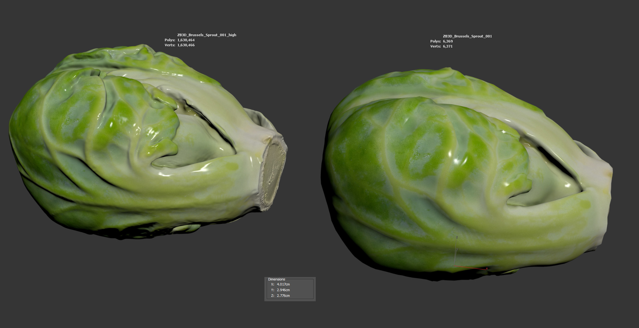 The brussels sprout model is presented as single mesh in 2 versions: low and high. Mesh is quad based. Base low model polycount is 6369. High detail model included in .max, .fbx, .c4d, .stl and .obj formats. High detail model has 1630k quads.