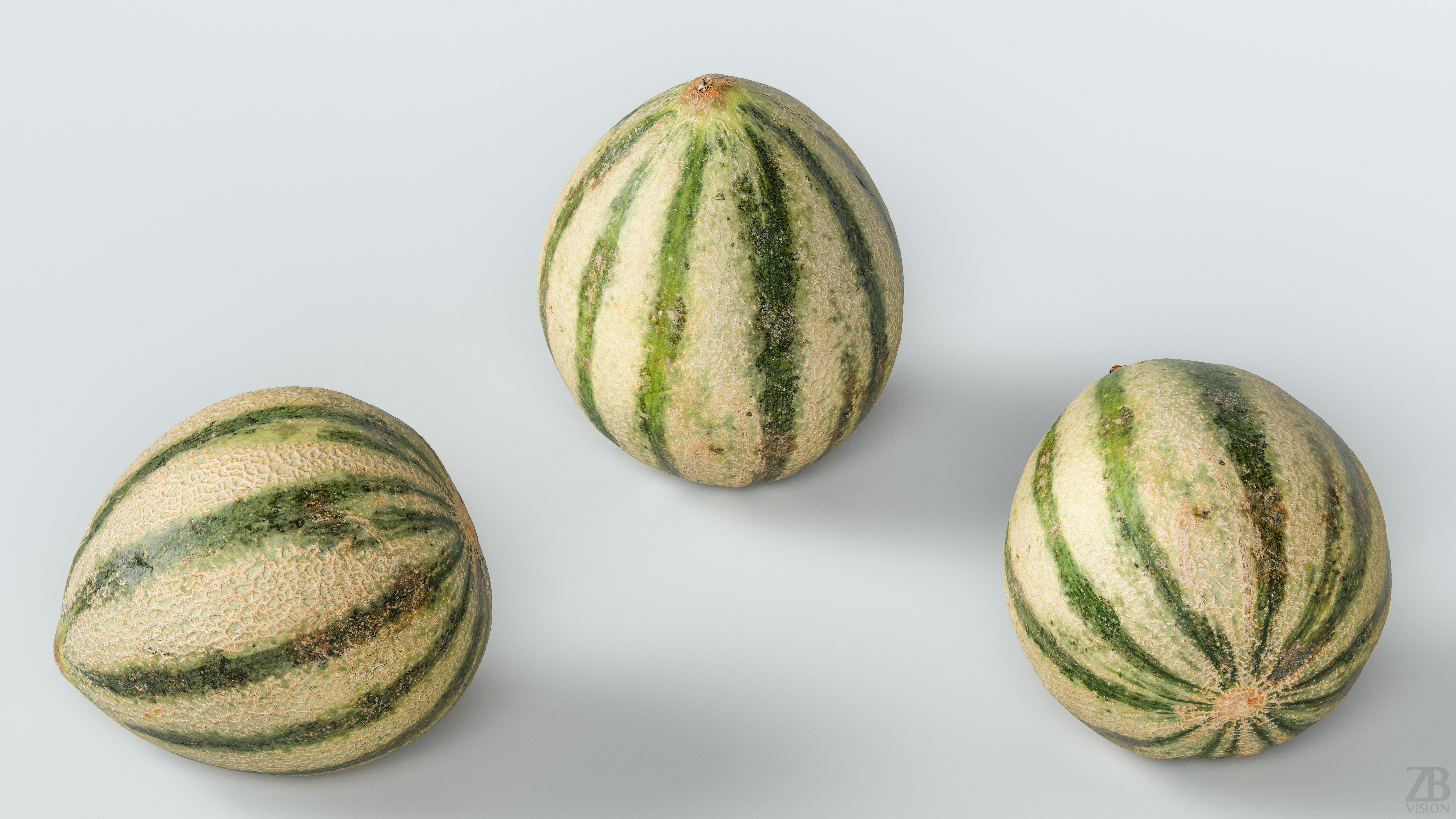 The melonw model is presented as single mesh in 3 subdivision levels: low, mid and high. Meshes are quad based. The polycounts are: 4K, 73K and 1182K . High detail model included in .max, .fbx and .obj formats.