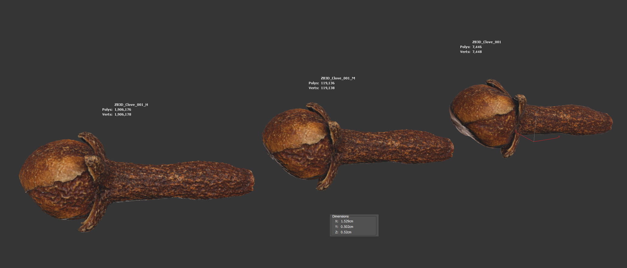 The clove model is presented as single mesh in 3 subdivision levels: low, mid and high. Meshes are quad based. The polycounts are: 7K, 119K and 1906K . High detail model included in .max, .fbx and .obj formats.