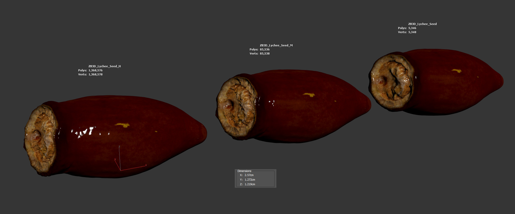 The lychee seed model is presented as single mesh in 3 subdivision levels: low, mid and high. Meshes are quad based. The polycounts are: 5K, 85K and 1368K . High detail model included in .max, .fbx and .obj formats.