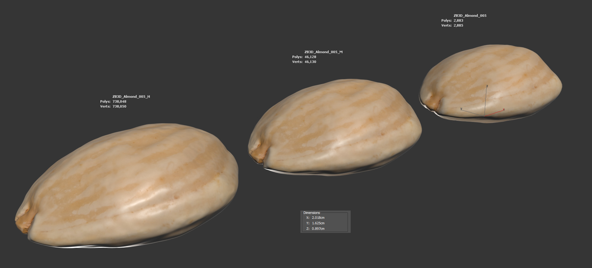 The almond model is presented as single mesh in 3 subdivision levels: low, mid and high. Meshes are quad based. The polycounts are: 2K, 46K and 738K . High detail model included in .max, .fbx and .obj formats.
