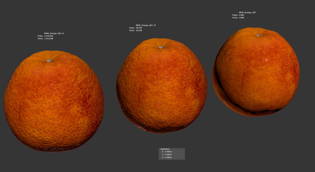 The orange model is presented as single mesh in 3 subdivision levels: low, middle and high. Meshes are quad based. The polycounts are: 4K, 78K and 1255K . High detail model included in .max, .fbx and .obj formats.