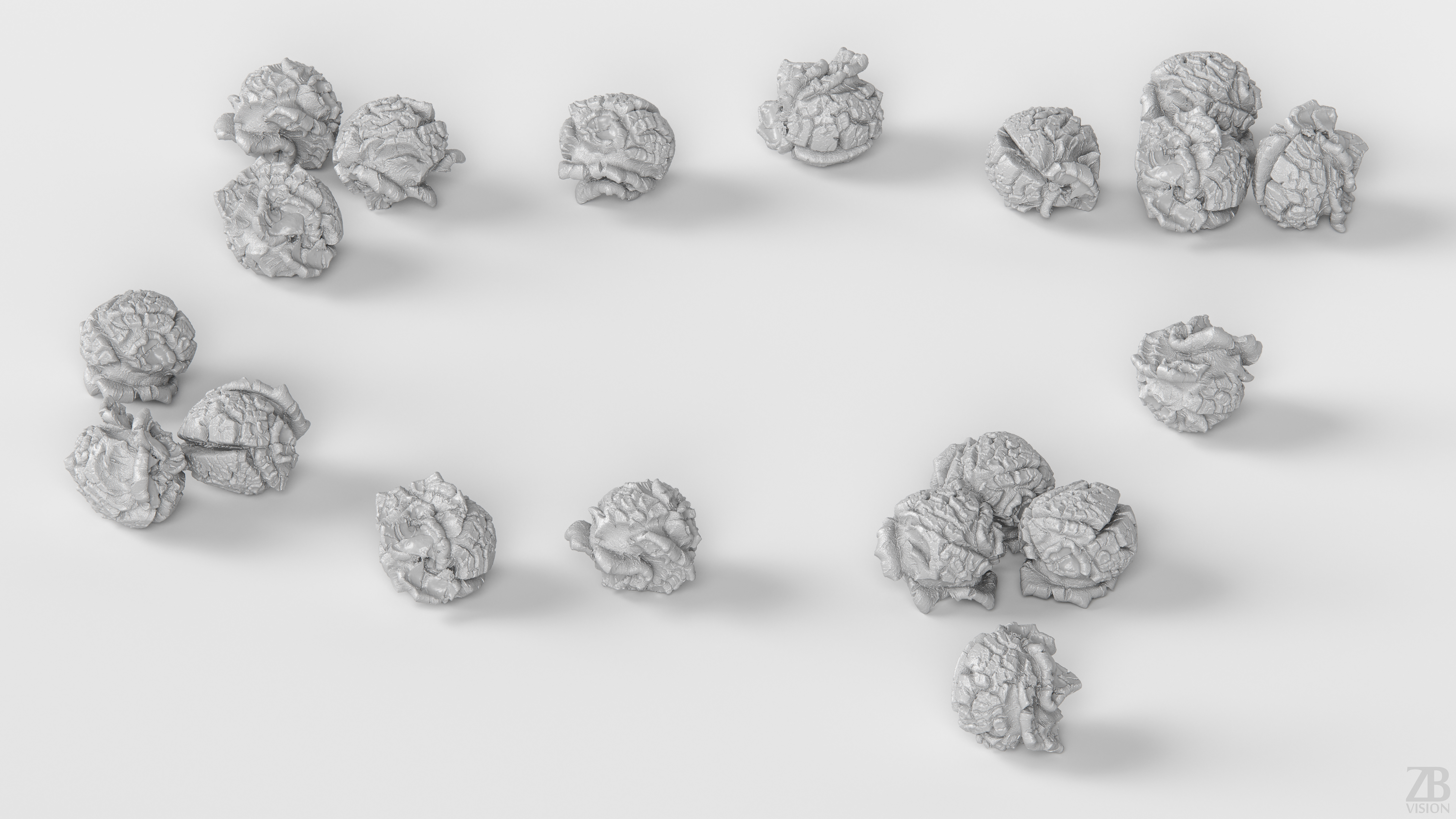 The pop corn model is presented as single mesh in 3 subdivision levels: low, mid and high. Meshes are quad based. The polycounts are: 40K, 163K and 2615K . High detail model included in .max, .fbx and .obj formats.