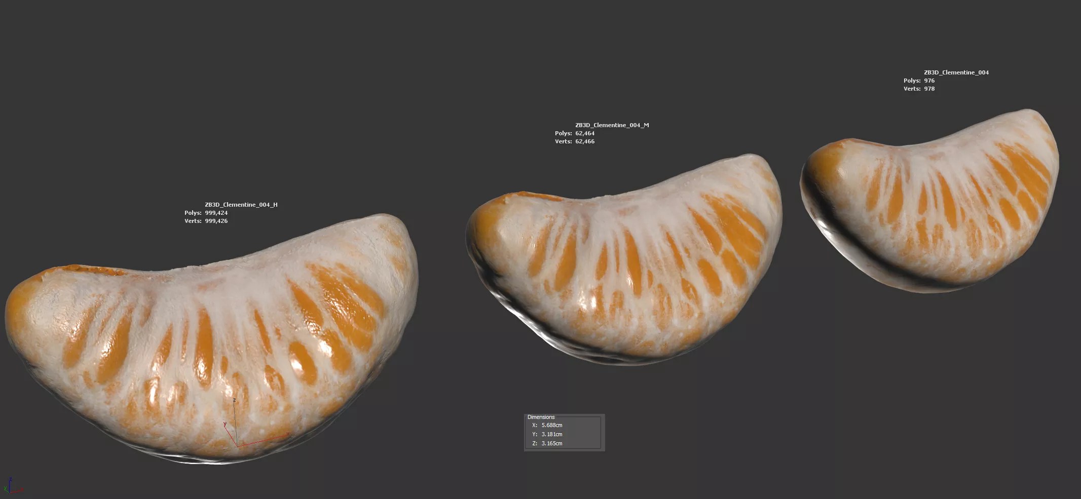 The clementine model is presented as single mesh in 3 subdivision levels: low, mid and high. Meshes are quad based. The polycounts are: 976, 62K and 999K . High detail model included in .max, .fbx and .obj formats.