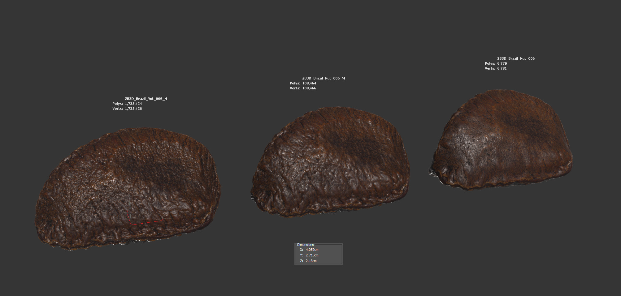The brazil nut model is presented as single mesh in 3 subdivision levels: low, mid and high. Meshes are quad based. The polycounts are: 6K, 108K and 1735K . High detail model included in .max, .fbx and .obj formats. Raw scan in .obj is provided.