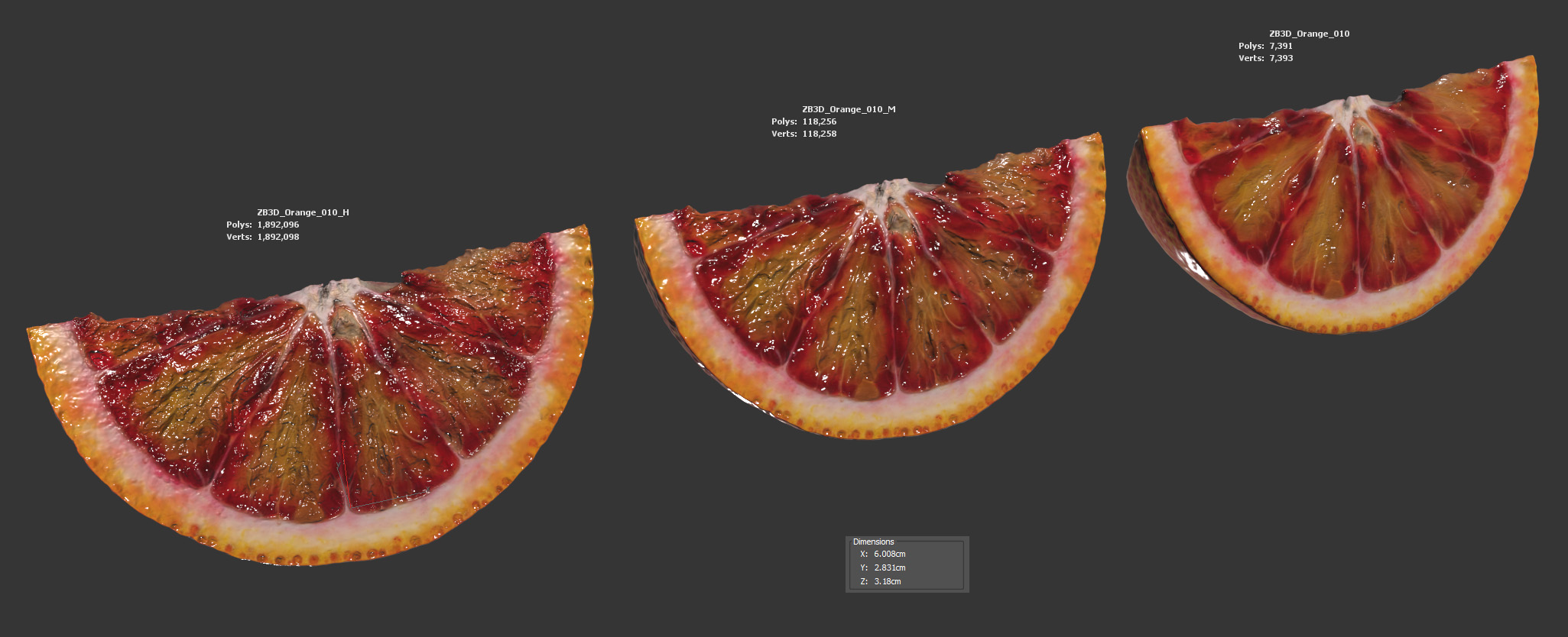 The orange model is presented as single mesh in 3 subdivision levels: low, mid and high. Meshes are quad based. The polycounts are: 7K, 118K and 1892K . High detail model included in .max, .fbx and .obj formats.