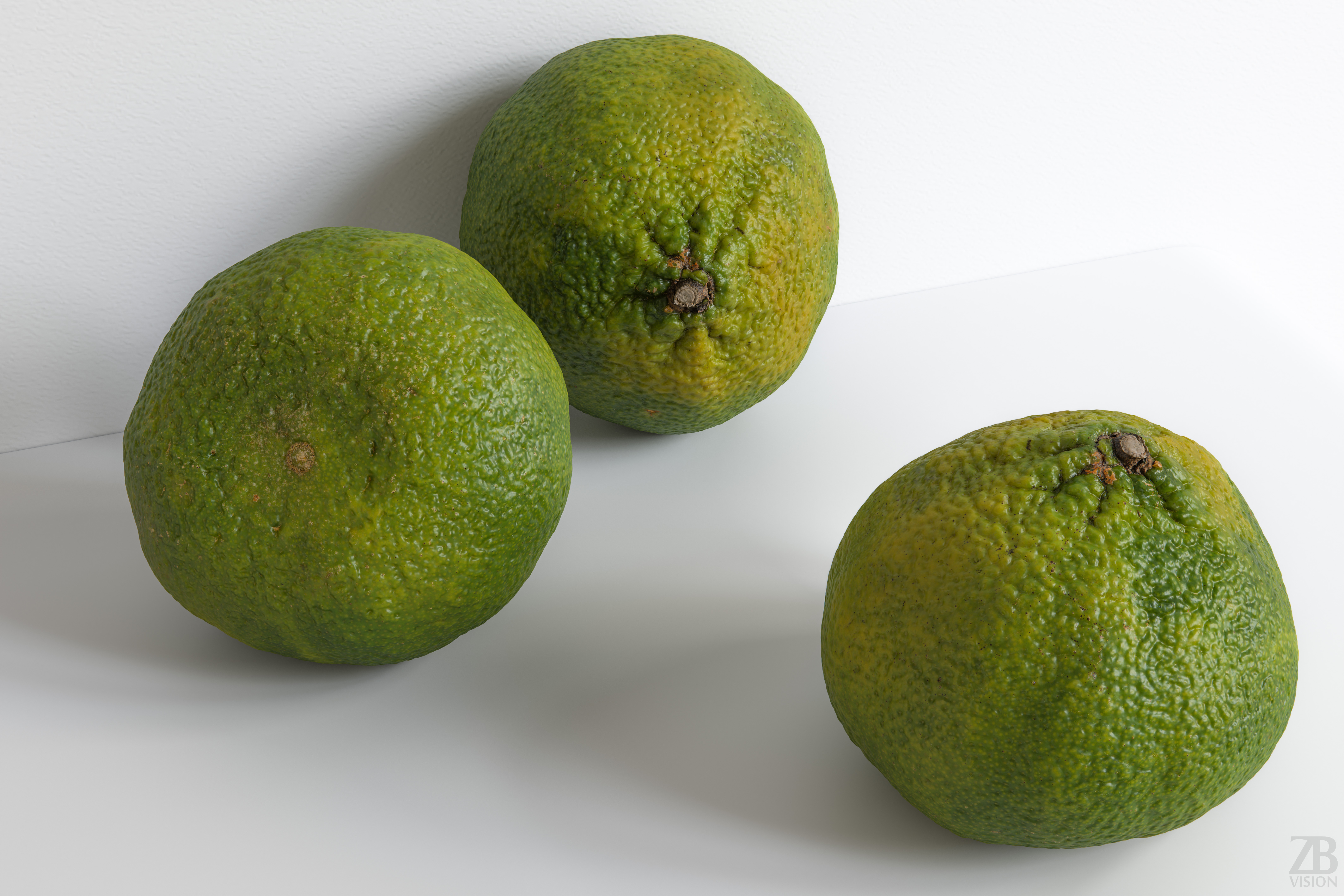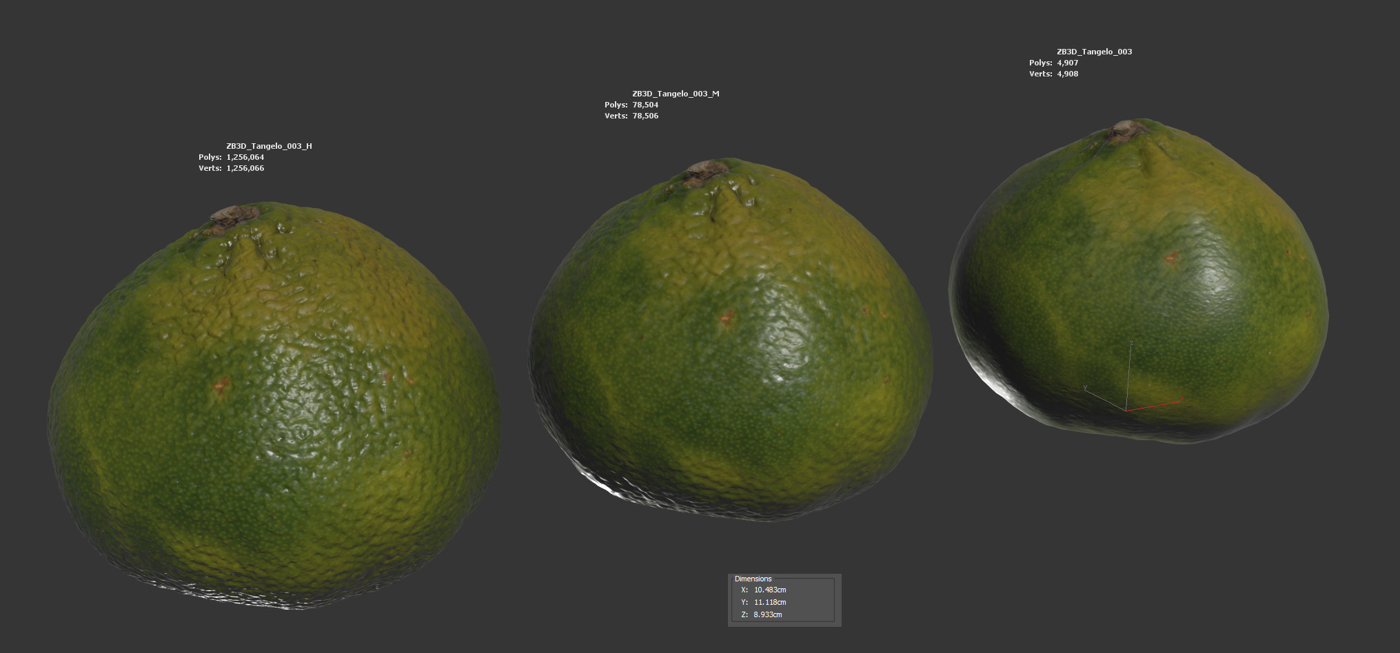 The tangelo model is presented as single mesh in 3 subdivision levels: low, mid and high. Meshes are quad based. The polycounts are: 4K, 78K and 1256K . High detail model included in .max, .fbx and .obj formats. Raw scan in .obj is provided.