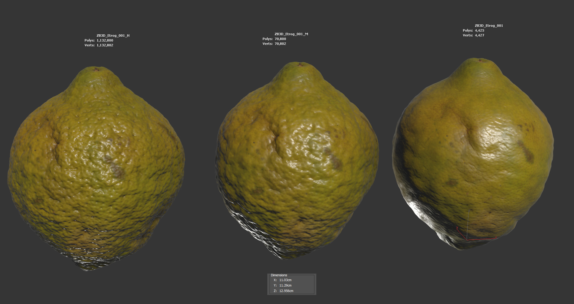 The etrog model is presented as single mesh in 3 subdivision levels: low, middle and high. Meshes are quad based. The polycounts are: 4K, 70K and 1132K . High detail model included in .max, .fbx and .obj formats. Raw scan included.