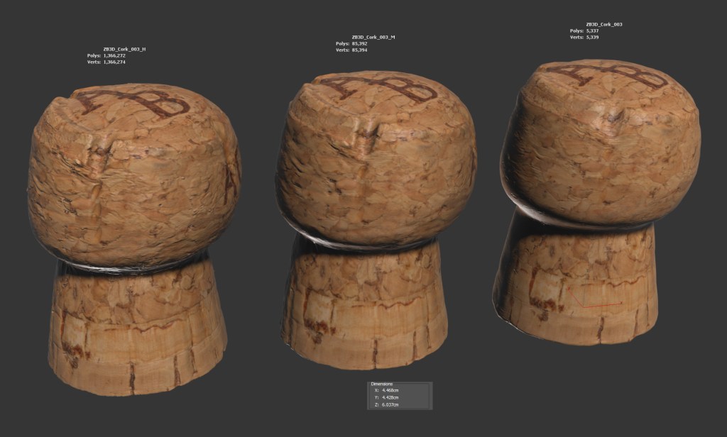 The cork model is presented as single mesh in 3 subdivision levels: low, mid and high. Meshes are quad based. The polycounts are: 5K, 85K and 1366K . High detail model included in .max, .fbx and .obj formats. Raw scan provided in .obj