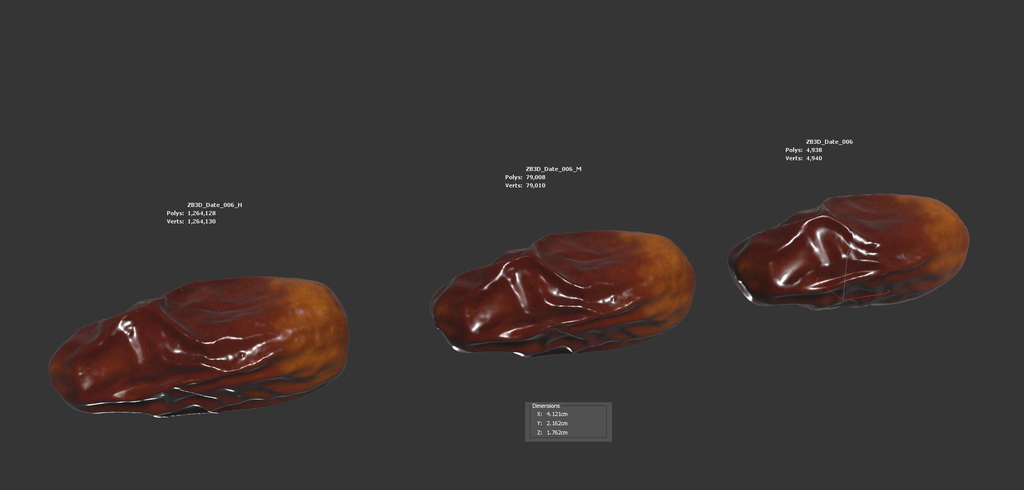 The date model is presented as single mesh in 3 subdivision levels: low, mid and high. Meshes are quad based. The polycounts are: 4K, 79K and 1264K . High detail model included in .max, .fbx and .obj formats.
