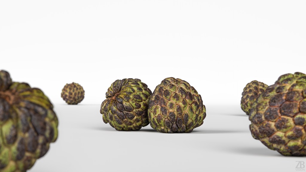This is a 3d model of a cherimoya. It was scanned and prepared for photorealistic renderings, close-ups, stills and animation. The custard apple model is ready to be inserted in your scene out of the box.