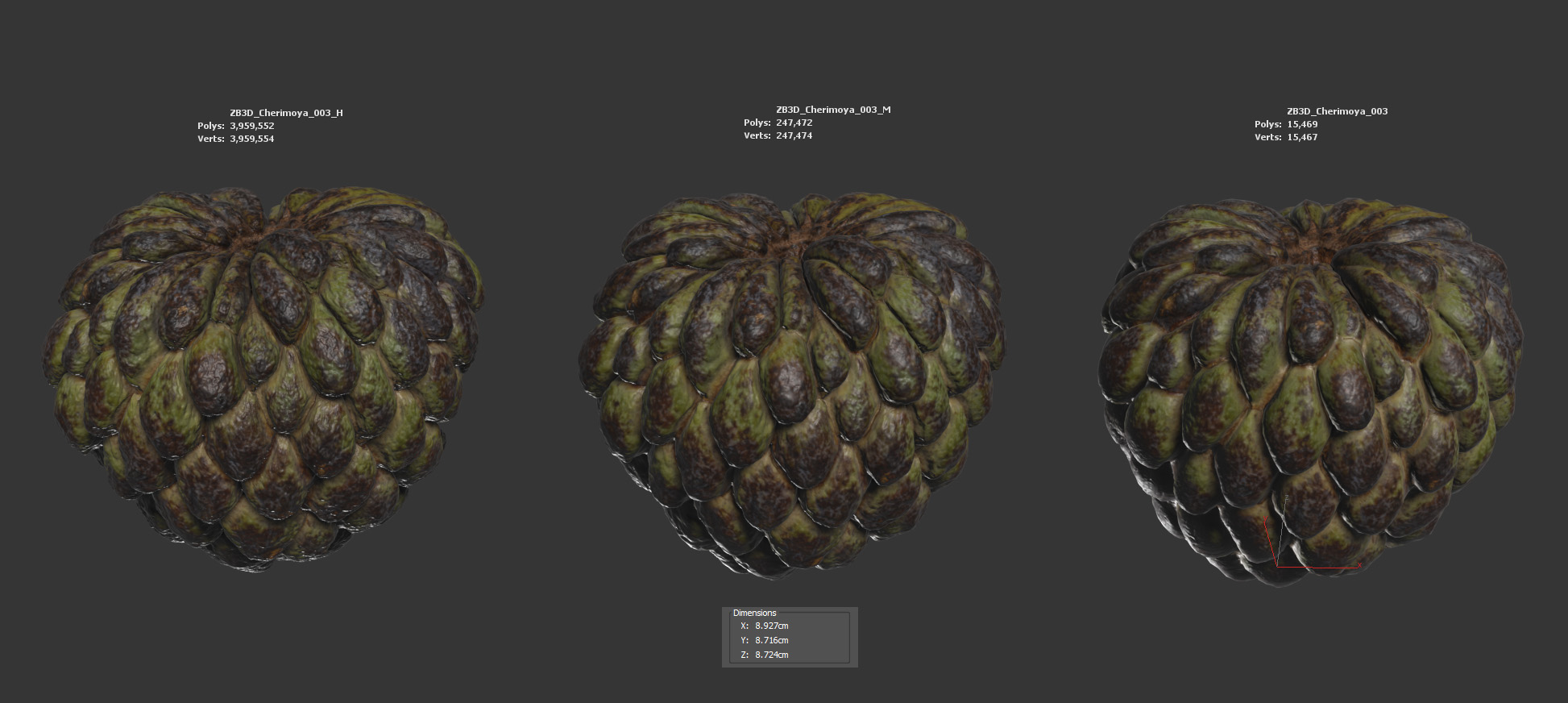 The annona model is presented as single mesh in 3 subdivision levels: low, mid and high. Meshes are quad based. The polycounts are: 15K, 247K and 3959K . High detail model included in .max, .fbx and .obj formats. Raw scan in .obj is provided.