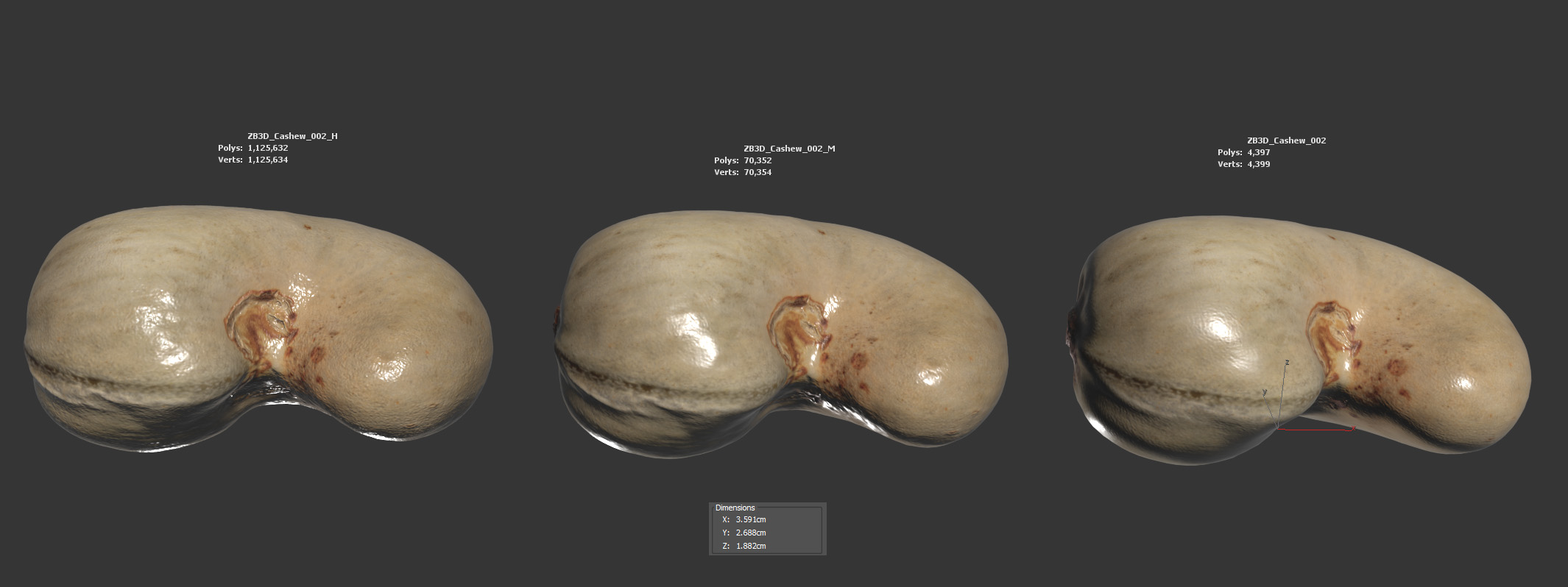 The cashew nut model is presented as single mesh in 3 subdivision levels: low, mid and high. Meshes are quad based. The polycounts are: 4K, 70K and 1125K . High detail model included in .max, .fbx and .obj formats. Raw scan in .obj is provided.