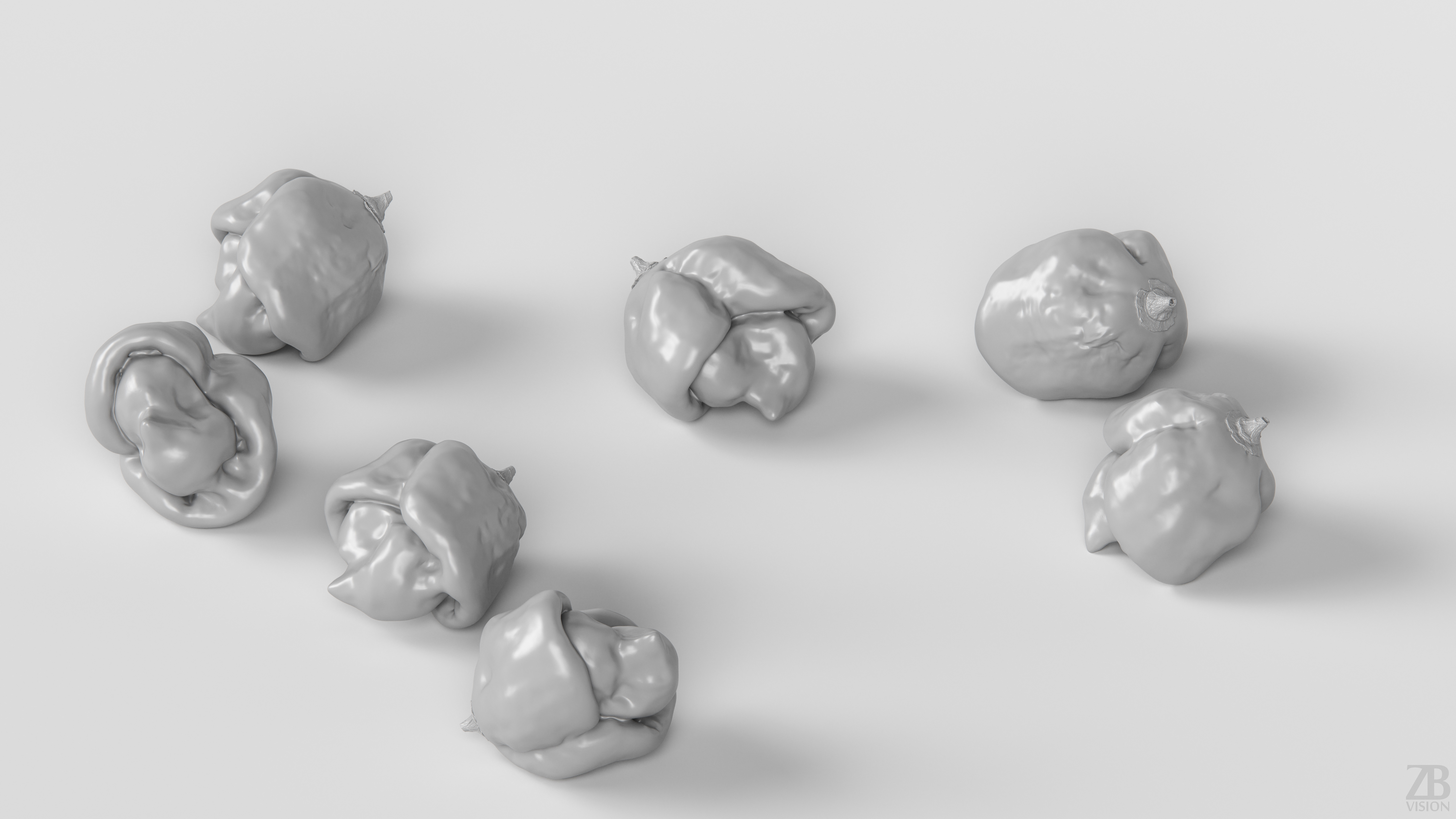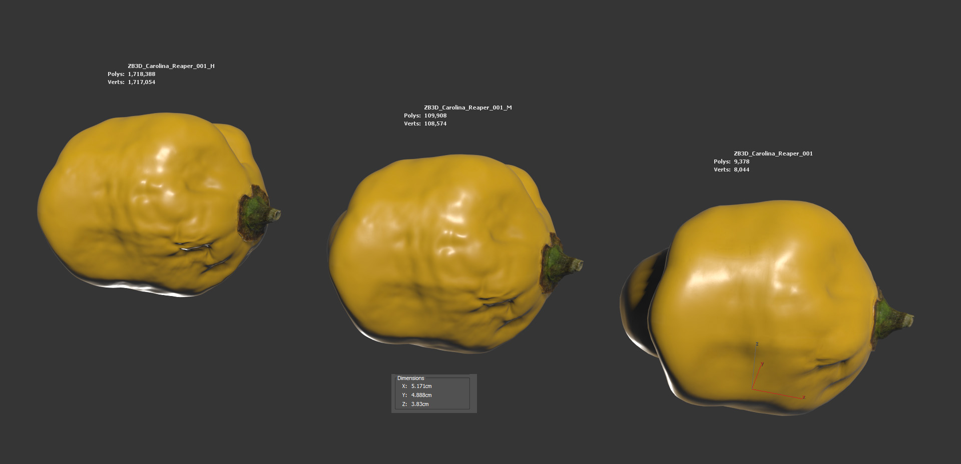 The spicy pepper model is presented as single mesh in 3 subdivision levels: low, mid and high. Meshes are quad based. The polycounts are: 9K, 109K and 1718K . High detail model included in .max, .fbx and .obj formats.