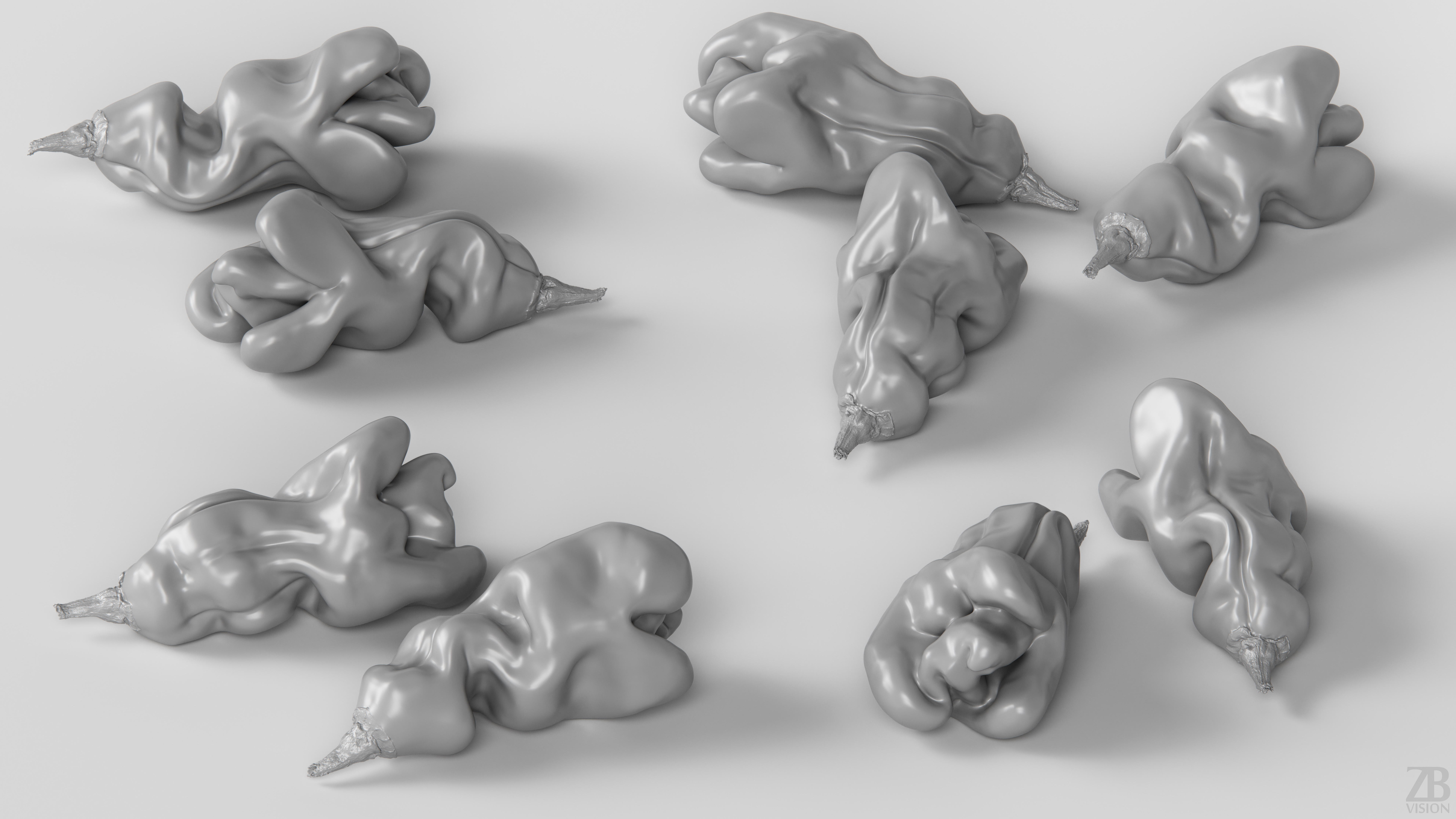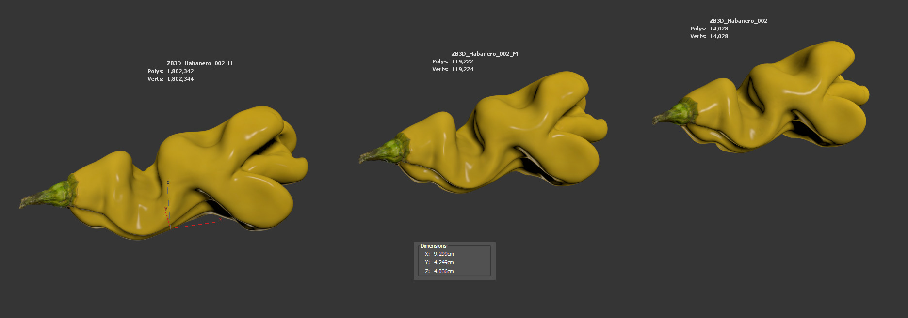 The spicy yellow pepper model is presented as single mesh in 3 subdivision levels: low, mid and high. Meshes are quad based. The polycounts are: 14K, 119K and 1802K . High detail model included in .max, .fbx and .obj formats.