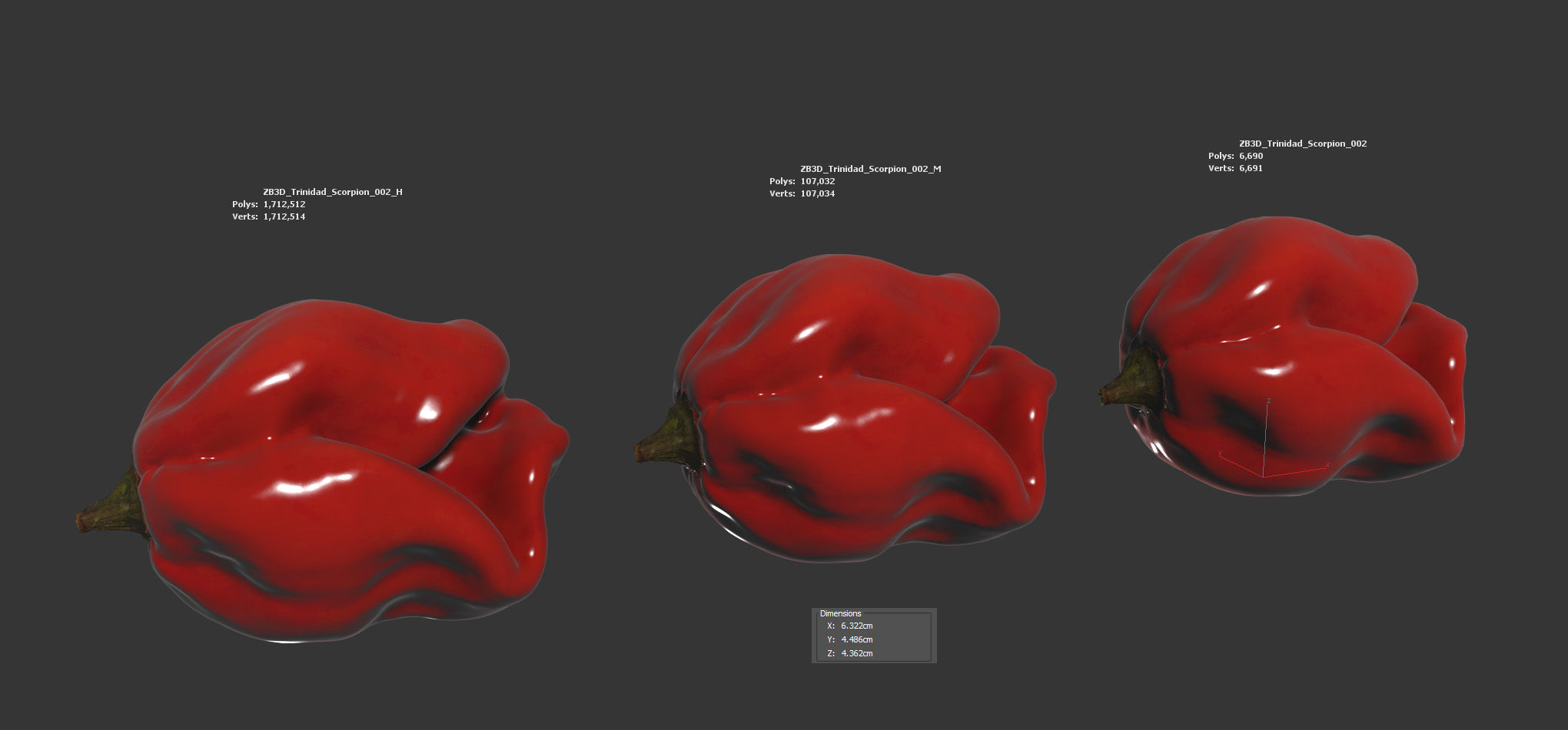 The spicy red pepper model is presented as single mesh in 3 subdivision levels: low, mid and high. Meshes are quad based. The polycounts are: 6K, 107K and 1712K . High detail model included in .max, .fbx and .obj formats.
