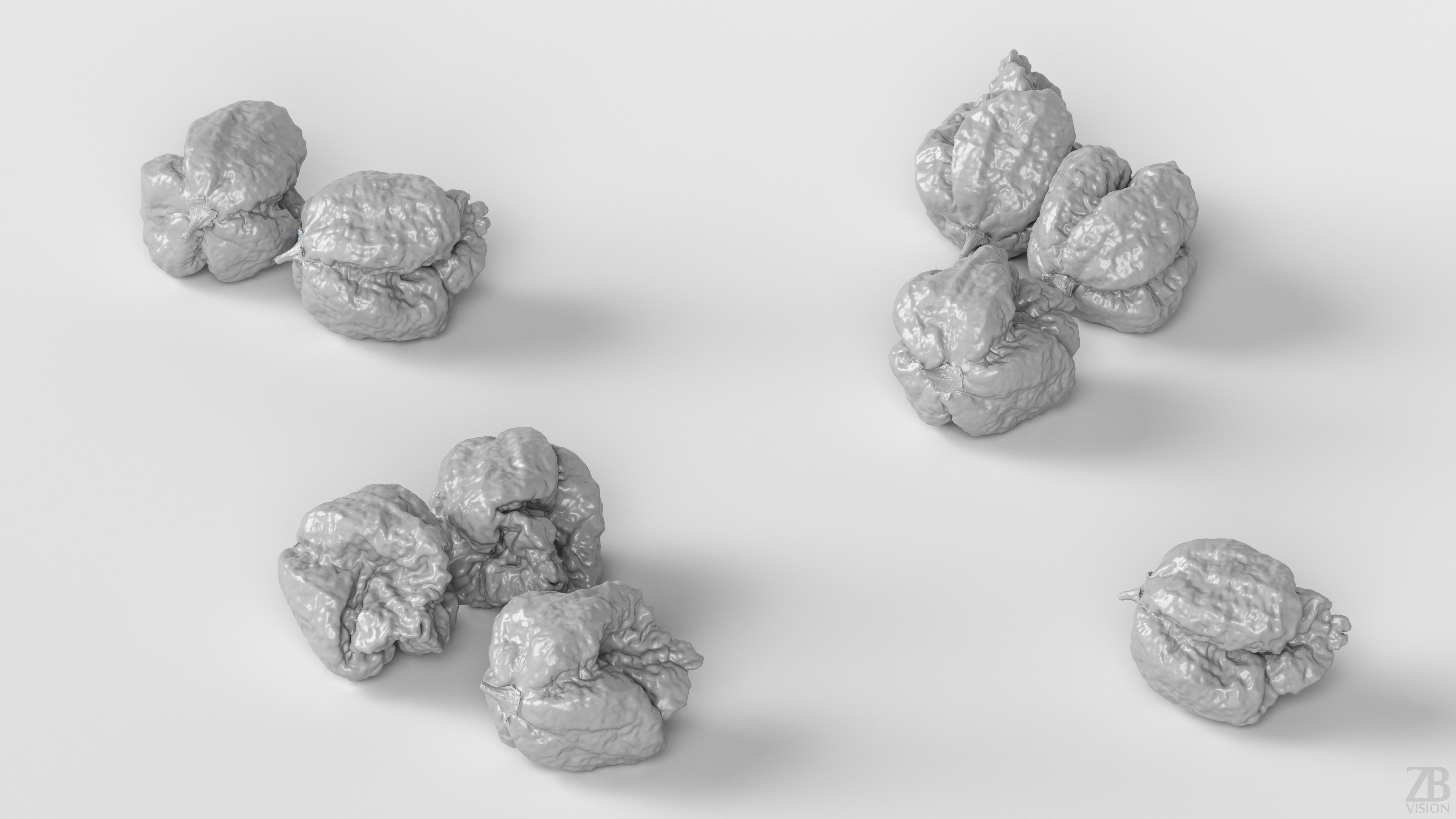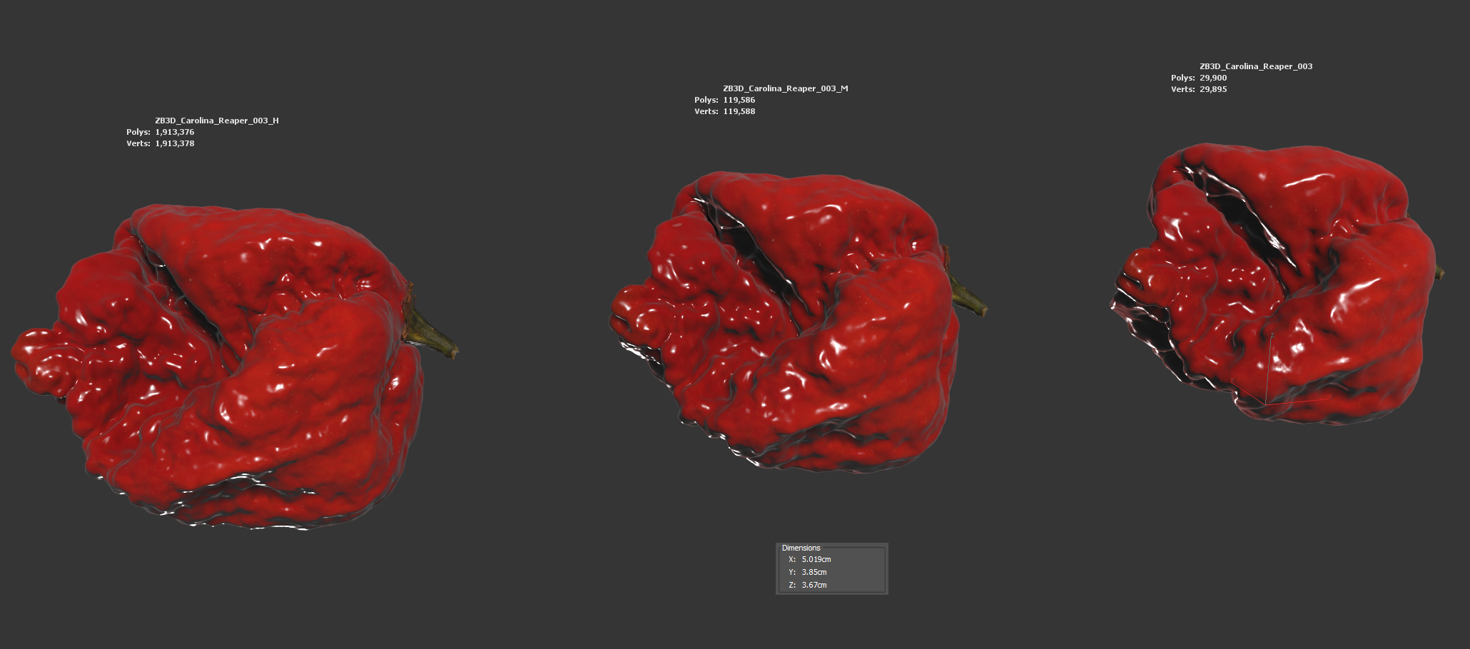 The spicy pepper model is presented as single mesh in 3 subdivision levels: low, mid and high. Meshes are quad based. The polycounts are: 29K, 119K and 1913K . High detail model included in .max, .fbx and .obj formats.