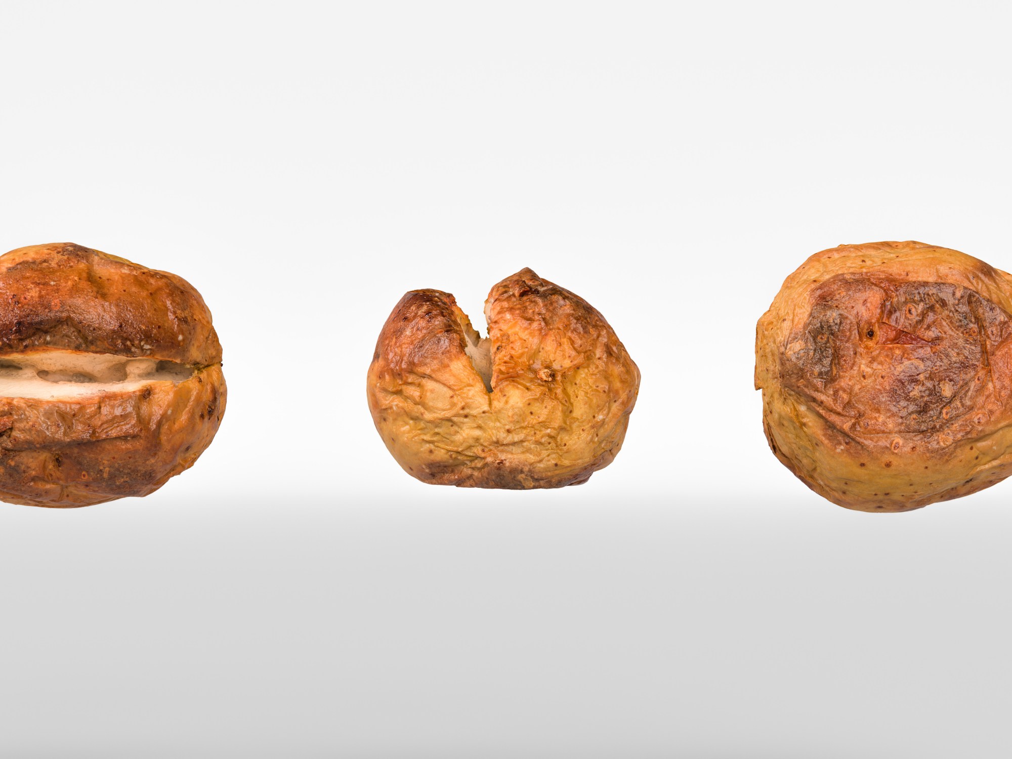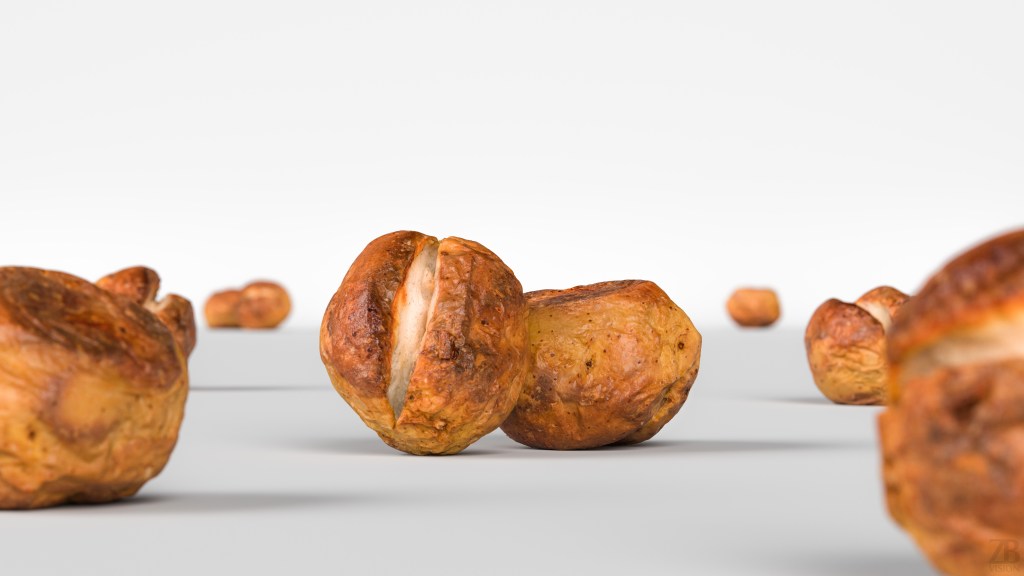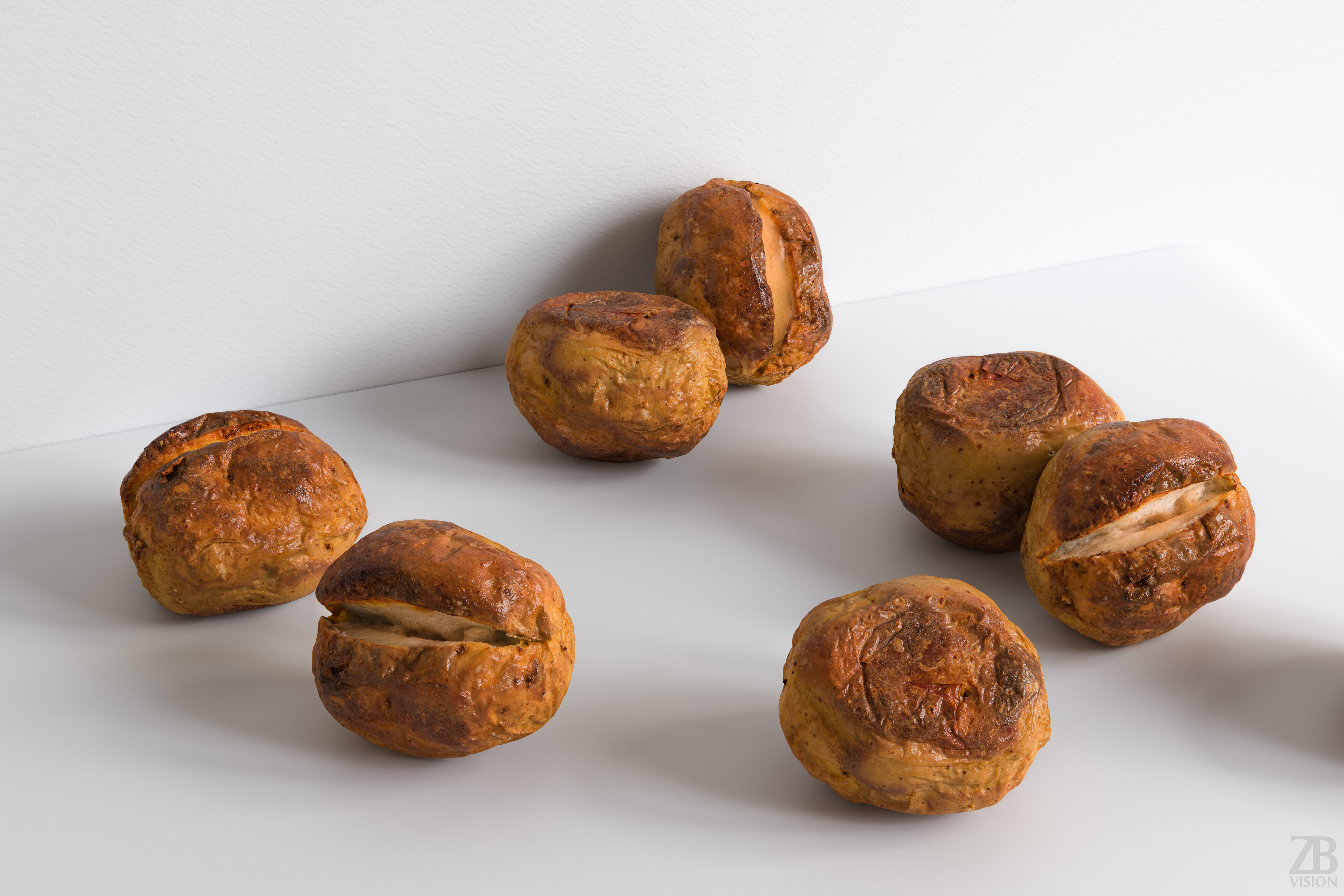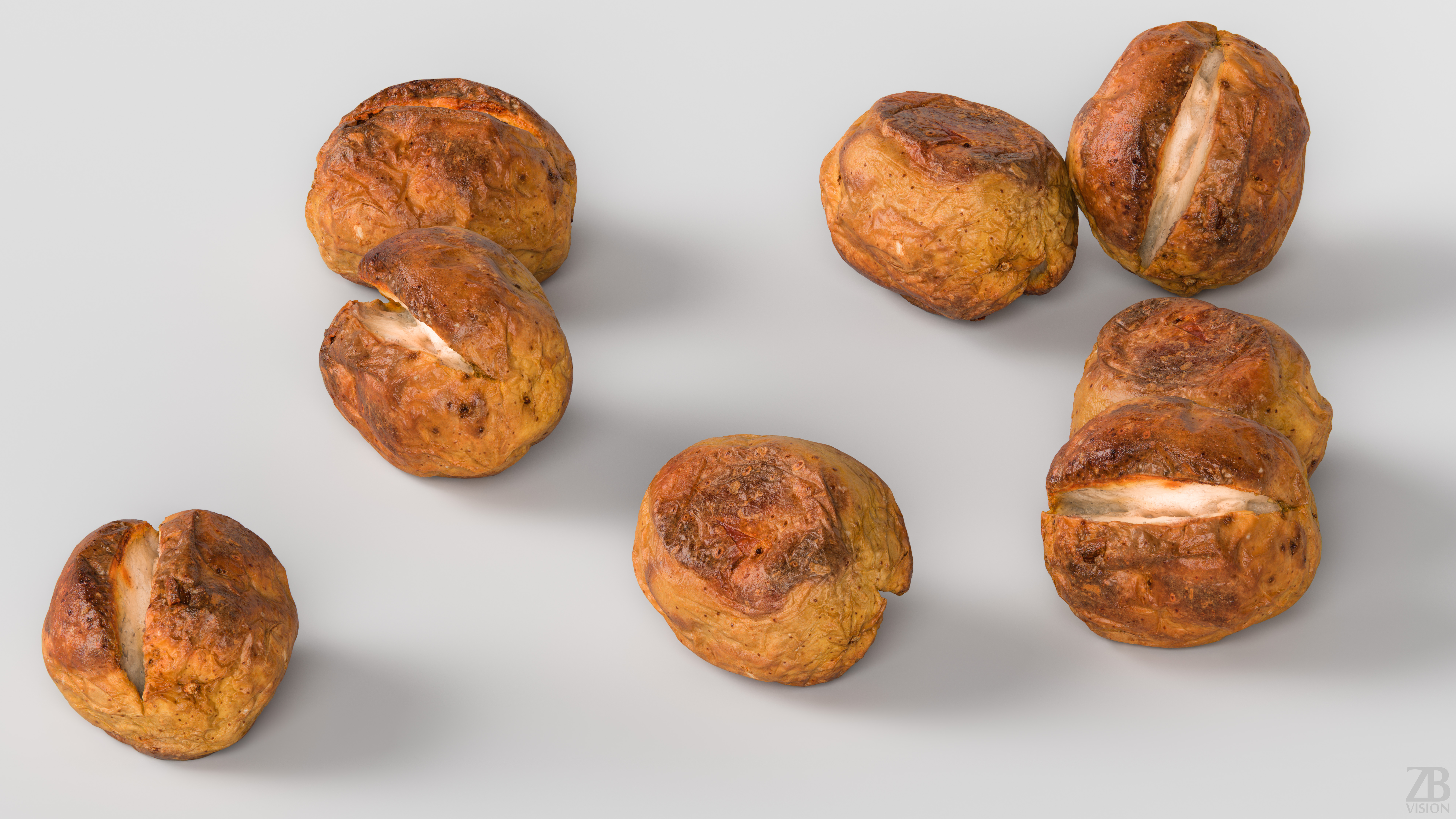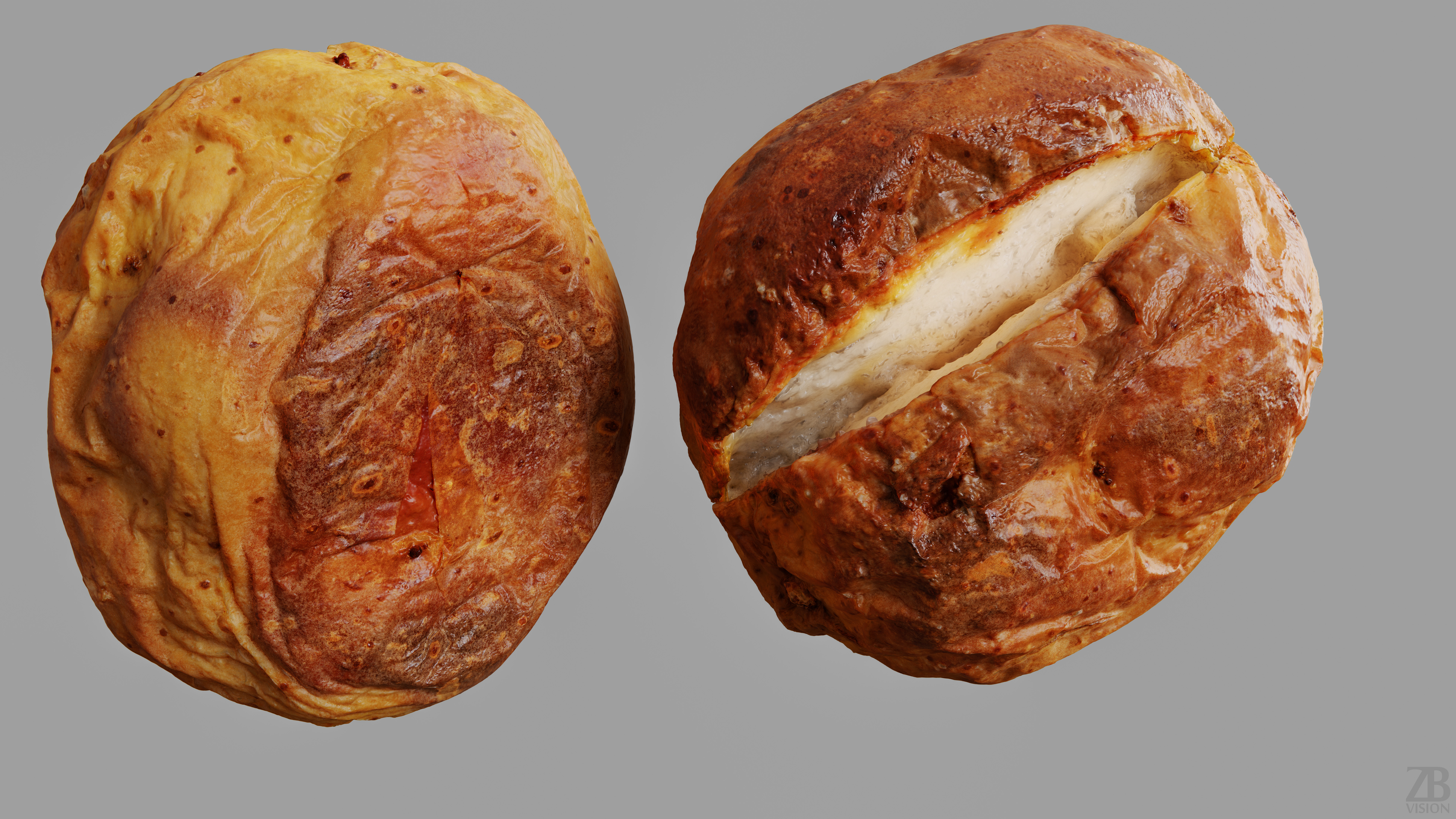 This is a 3d model of a oven baked potato. It was scanned and prepared for photorealistic renderings, close-ups, stills and animation. The baked potato model is ready to be inserted in your scene out of the box.