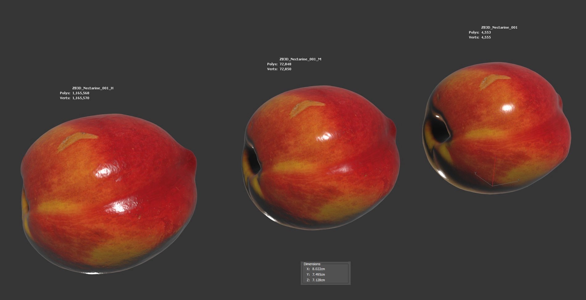 Enhance your visualizations, product designs, or still-life projects with this ultra-realistic 3D nectarine model. Meticulously photogrammetry scanned and textured, it boasts multiple levels of detail (4K, 72K, 1165K polycounts) for close-ups and broader scenes.