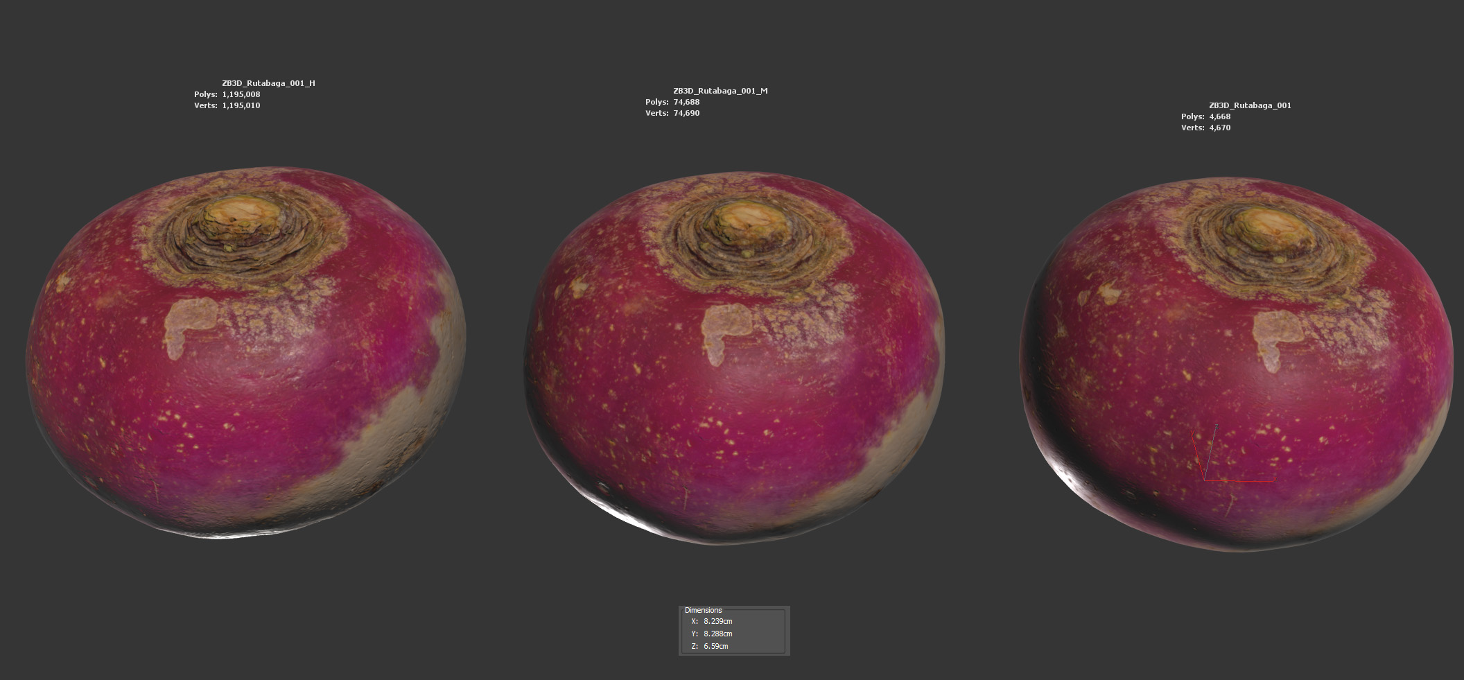 The rutabaga model is presented as single mesh in 3 subdivision levels: low, mid and high. Meshes are quad based. The polycounts are: 4K, 74K and 1195K . High detail model included in .max, .fbx and .obj formats.