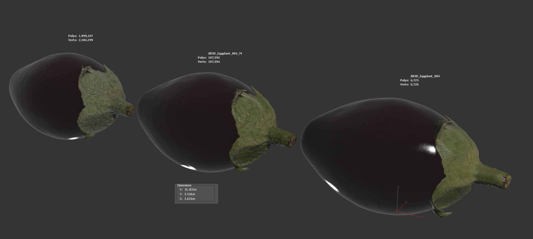 The eggplant model is presented as single mesh in 3 subdivision levels: low, mid and high. Meshes are quad based. The polycounts are: 6K, 107K and 1999K . High detail model included in .max, .fbx and .obj formats.