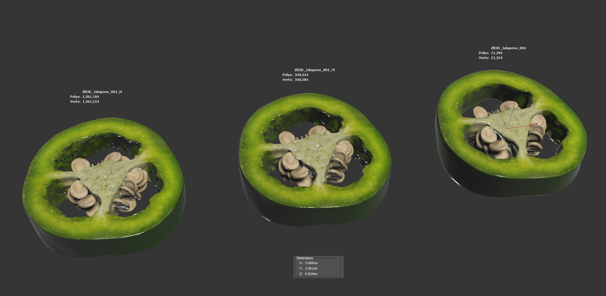 The jalapeno model is presented as single mesh in 3 subdivision levels: low, mid and high. Meshes are quad based. The polycounts are: 21K, 340K and 1561K . High detail model included in .max, .fbx and .obj formats.