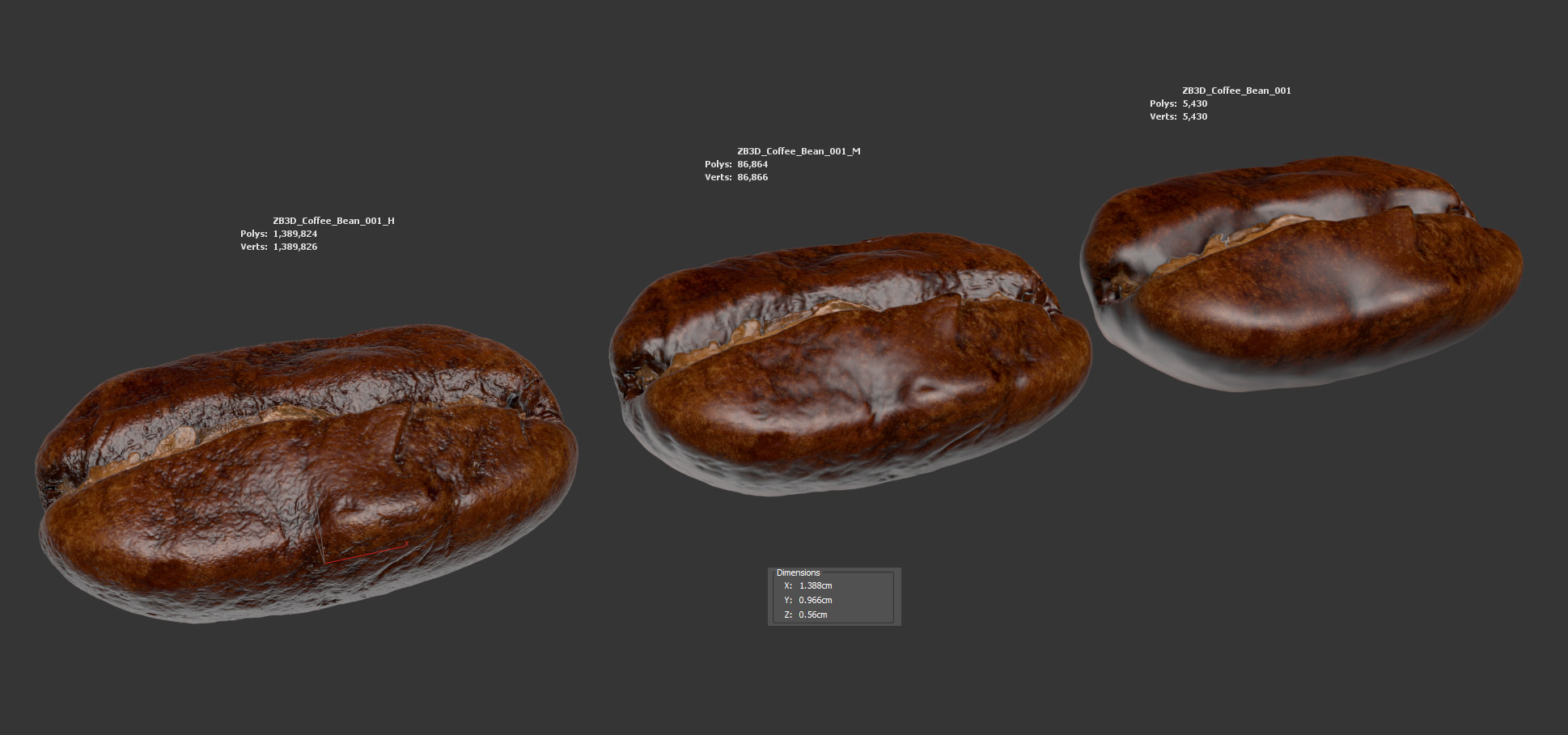 The coffee bean model is presented as single mesh in 3 subdivision levels: low, mid and high. Meshes are quad based. The polycounts are: 5K, 86K and 1389K . High detail model included in .max, .fbx and .obj formats. Raw scan in .obj is provided.