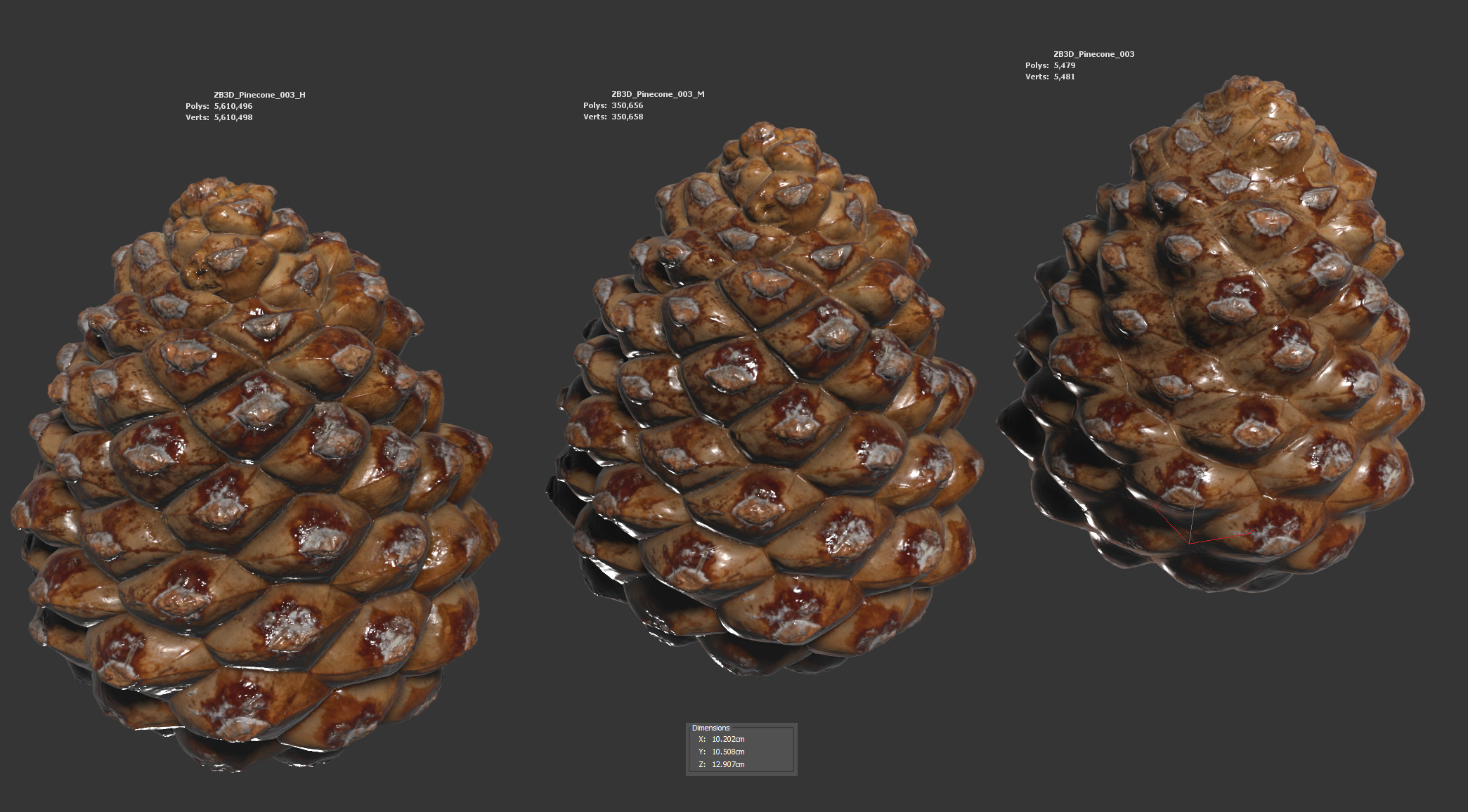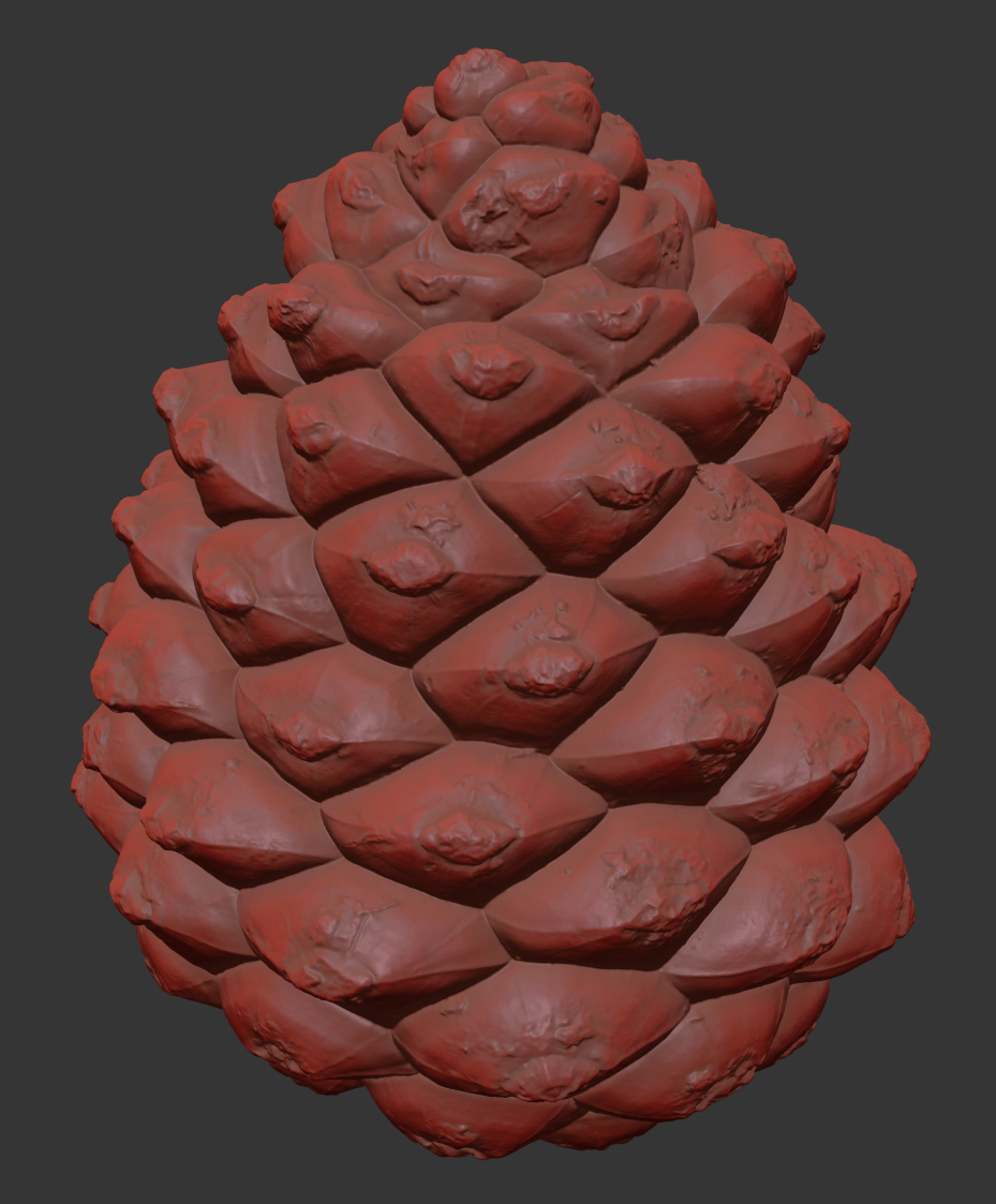 The pinecone model is presented as single mesh in 3 subdivision levels: low, mid and high. Meshes are quad based. The polycounts are: 5K, 350K and 5610K . High detail model included in .max, .fbx and .obj formats.
