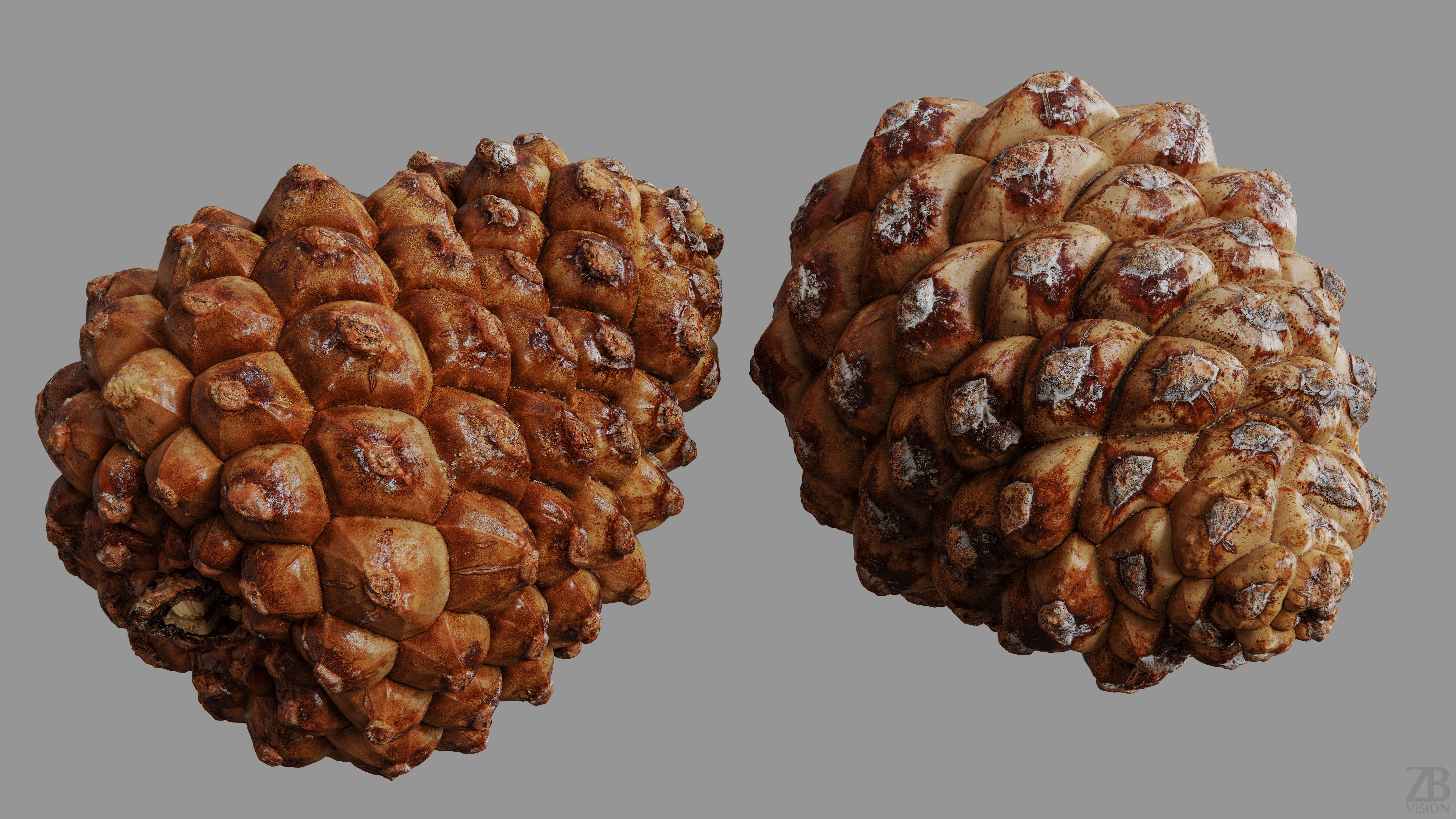6 maps are supplied with this model. Textures supplied are in JPG format and are in 2K, 4K and 8K resolution. The texture maps include ao, diffuse, glossiness, roughness, normal and displacement(tif). The pinecone model is uvw unwrapped. 16K diffuse included.