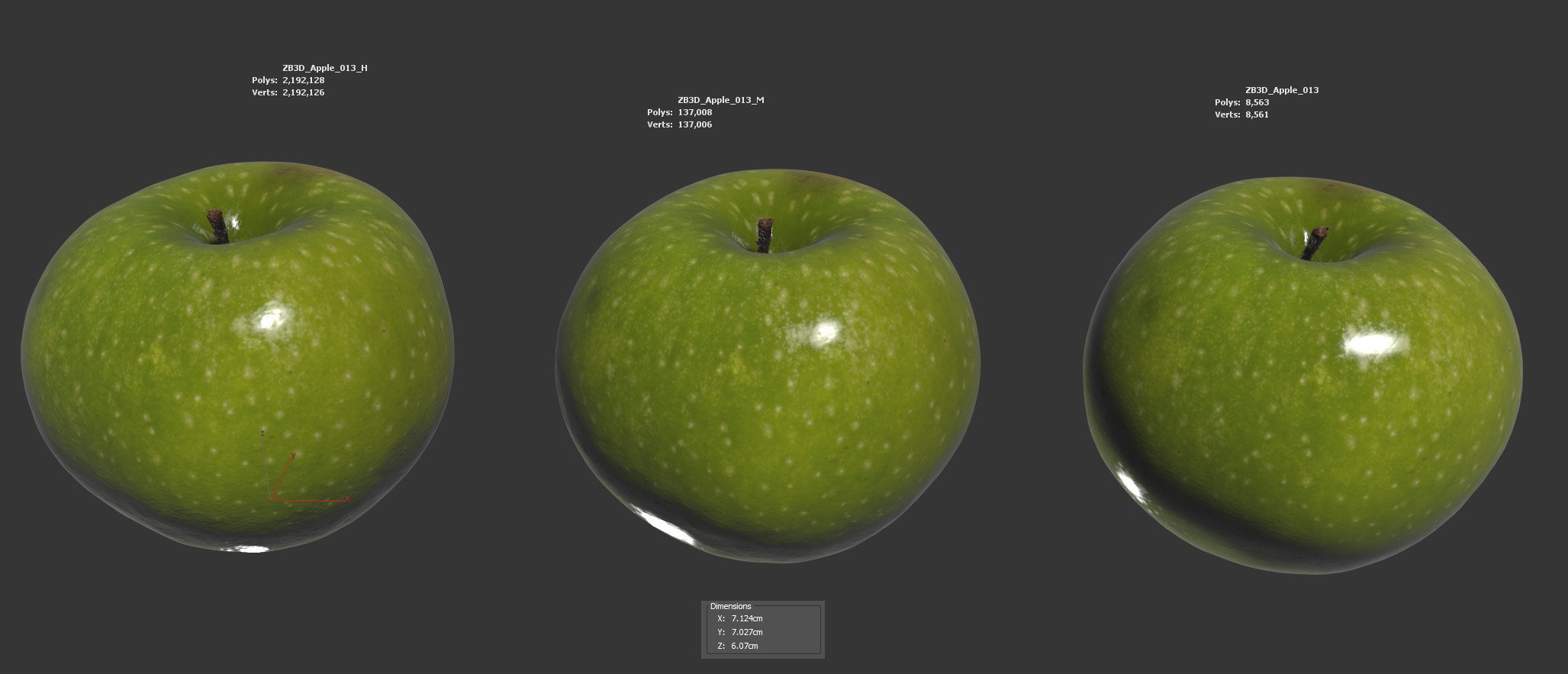 The apple model is presented as single mesh in 3 subdivision levels: low, mid and high. Meshes are quad based. The polycounts are: 5K, 350K and 5610K . High detail model included in .max, .fbx and .obj formats.