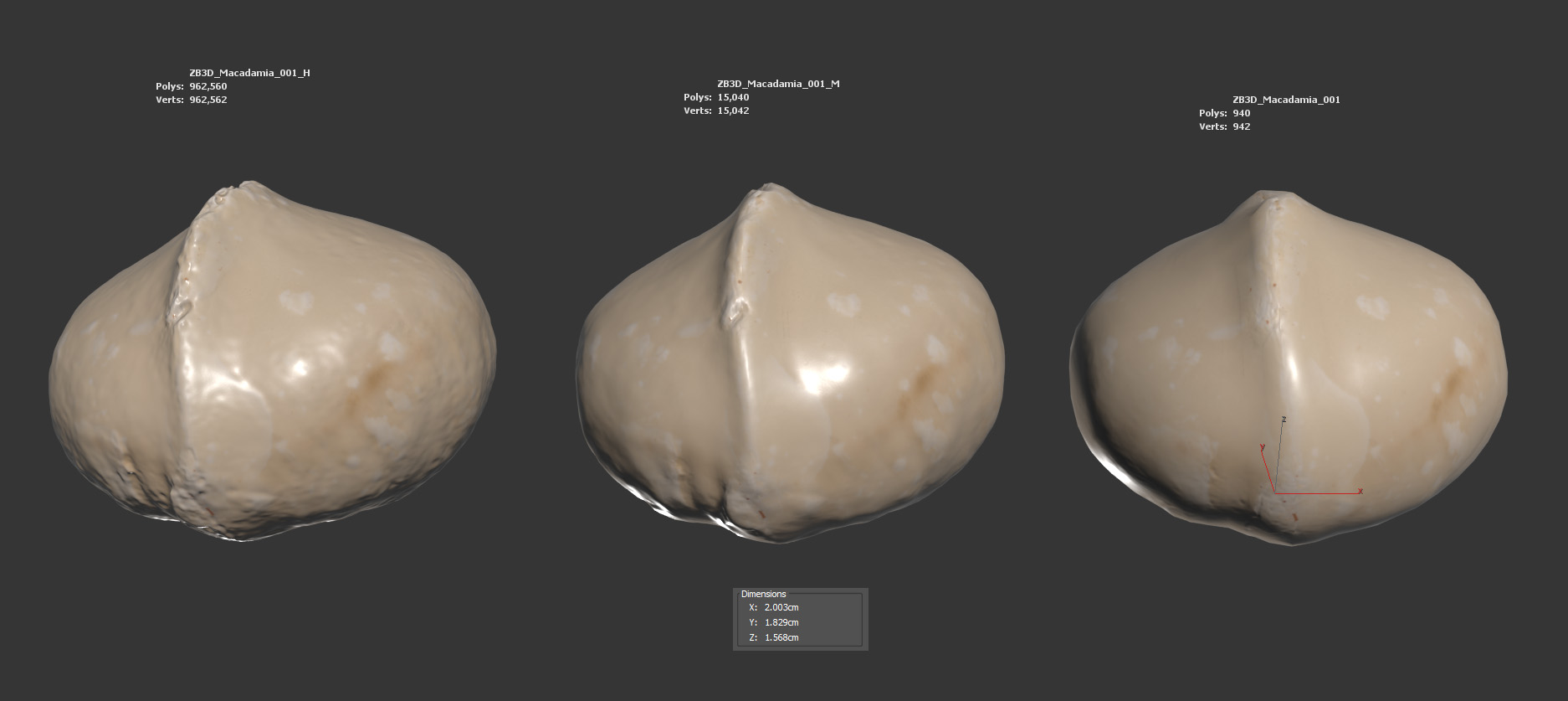 The macadamia model is presented as a single mesh in 3 subdivision levels: low, mid, and high. Meshes are quad based. The polycounts are 940, 15K, and 962K. The high-detail model is included in .max, .fbx, and .obj formats.