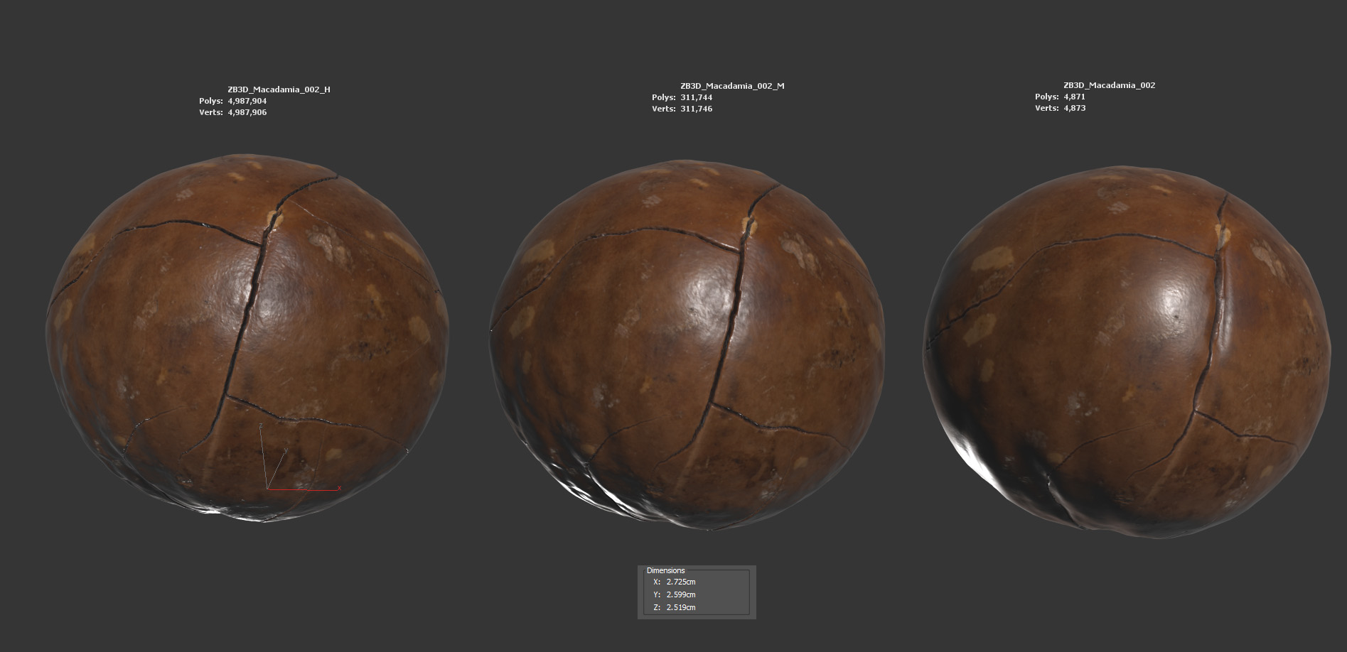The macadamia model is presented as a single mesh in 3 subdivision levels: low, mid, and high. Meshes are quad based. The polycounts are 4K, 311K, and 4987K. The high-detail model is included in .max, .fbx, and .obj formats.