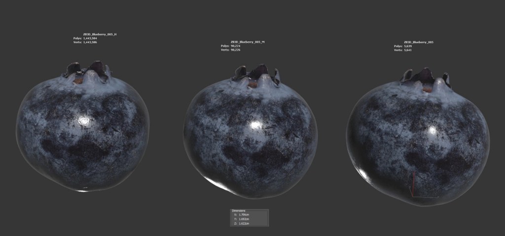 Enhance your visualizations, product designs, or still-life projects with this ultra-realistic 3D blueberry model. Meticulously photogrammetry scanned and textured, it boasts multiple levels of detail (5K, 90K, and 1443K polycounts) for close-ups and broader scenes.