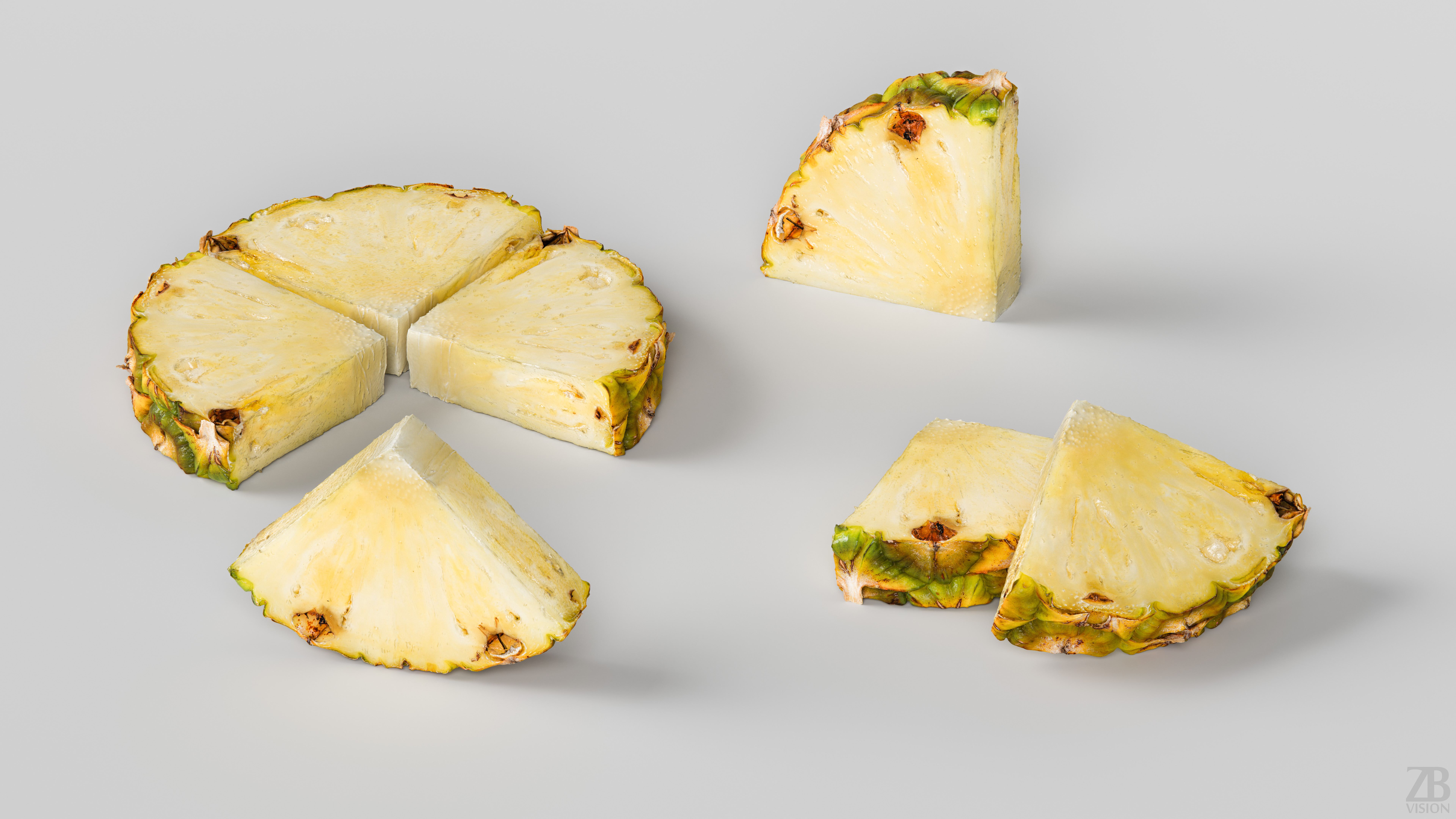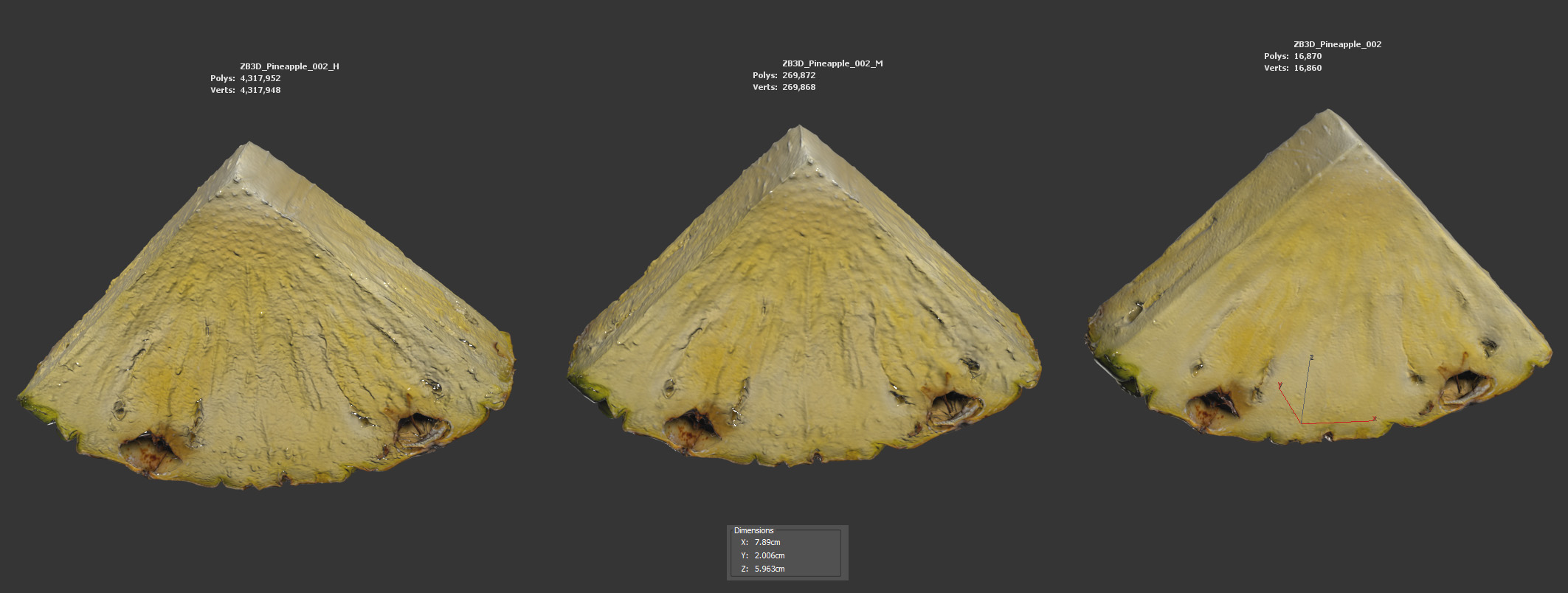 The pineapple model is presented as a single mesh in 3 subdivision levels: low, mid, and high. Meshes are quad based. The polycounts are 16K, 269K, and 4317K. The high-detail model is included in .max, .fbx, and .obj formats.