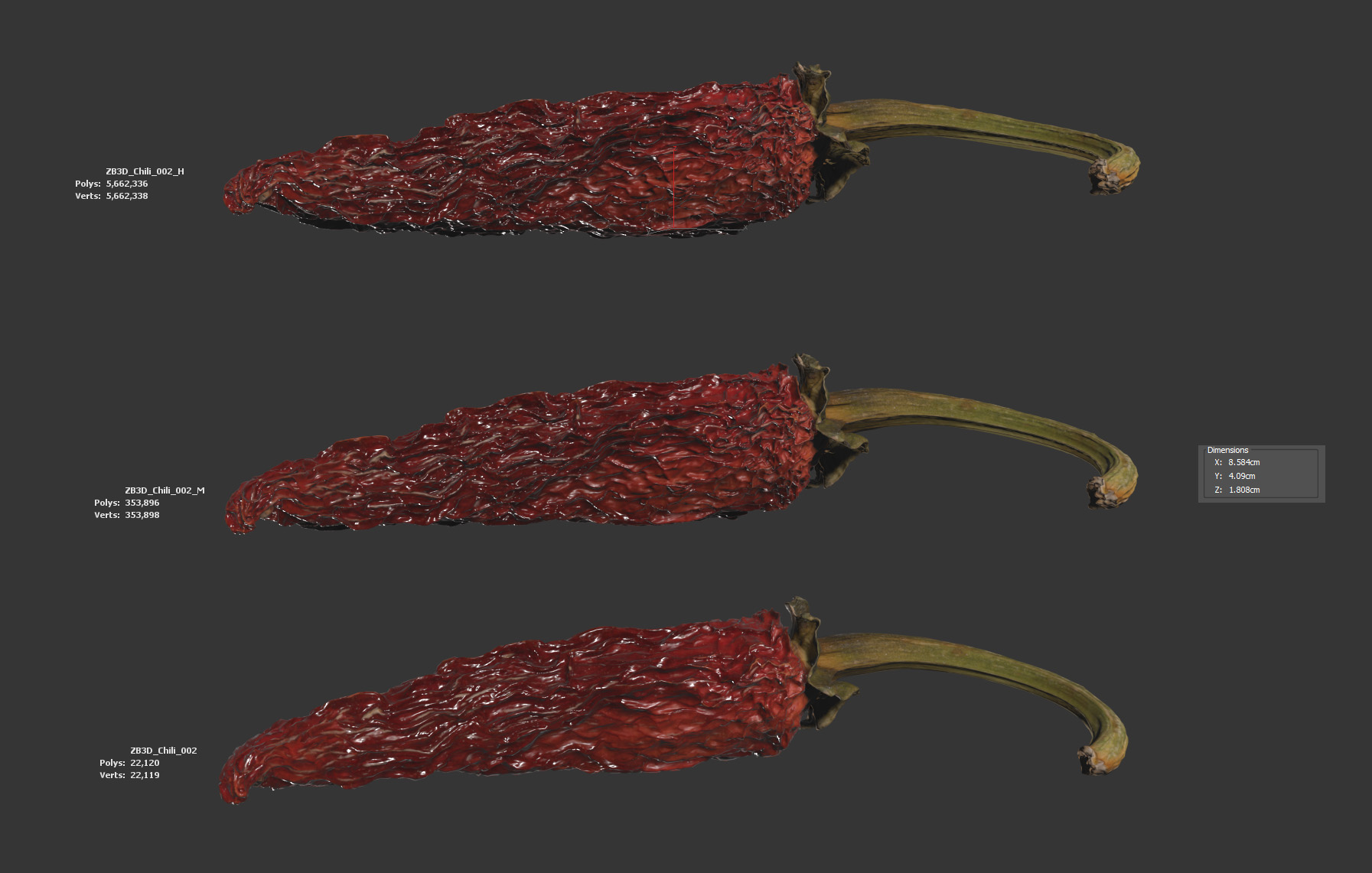 The chili pepper model is presented as a single mesh in 3 subdivision levels: low, mid, and high. Meshes are quad based. The polycounts are 22K, 353K, and 5662K. The high-detail model is included in .max, .fbx, and .obj formats.