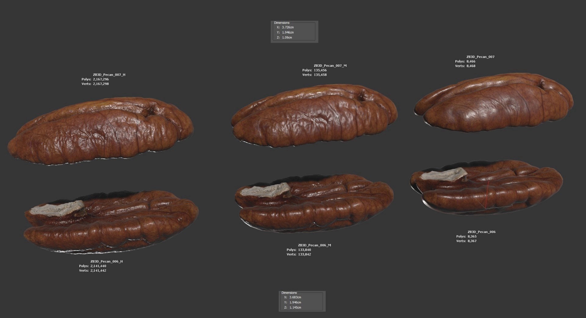 Enhance your visualizations, product designs, or still-life projects with this ultra-realistic 3D pecan model. Meticulously photogrammetry scanned and textured, it boasts multiple levels of detail (8365, 135K, and 2167K polycounts) for close-ups and broader scenes.