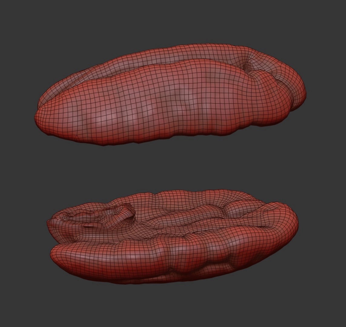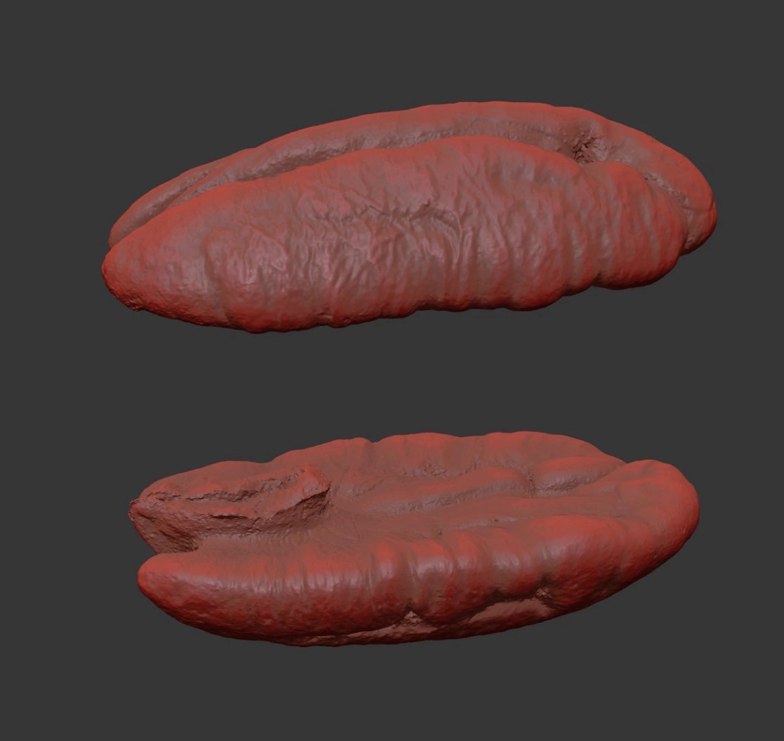 Photorealistic 3D pecan model, 2 halves from the same nut shell