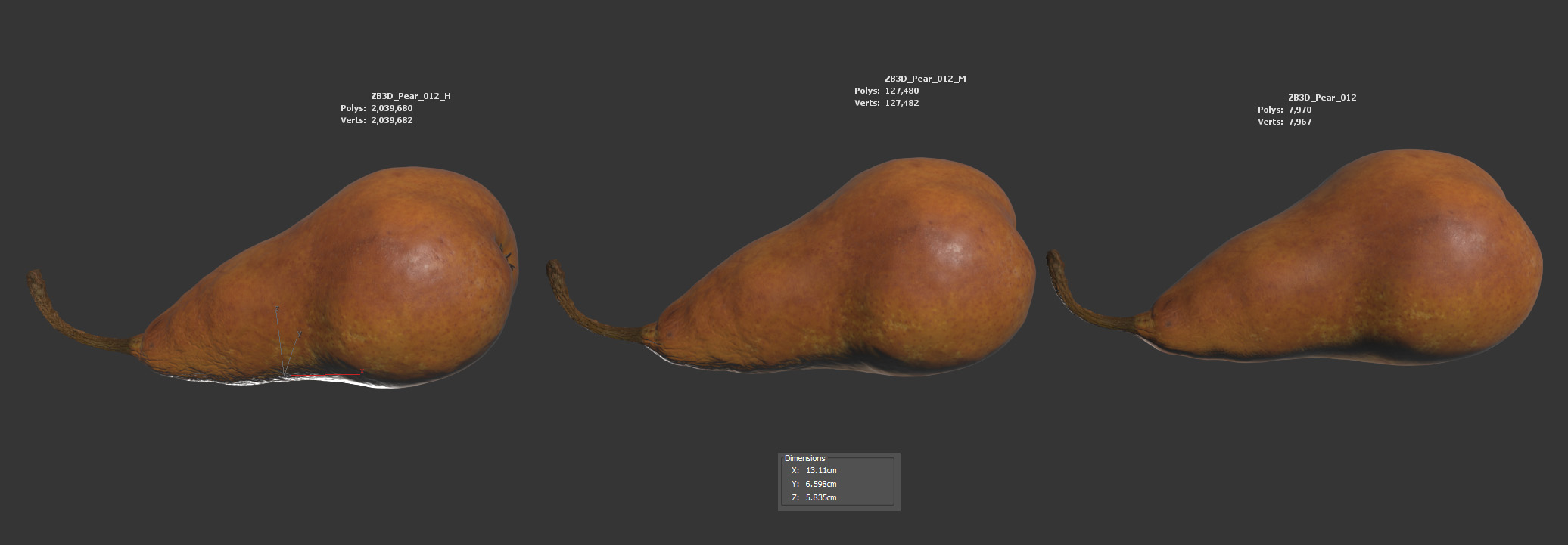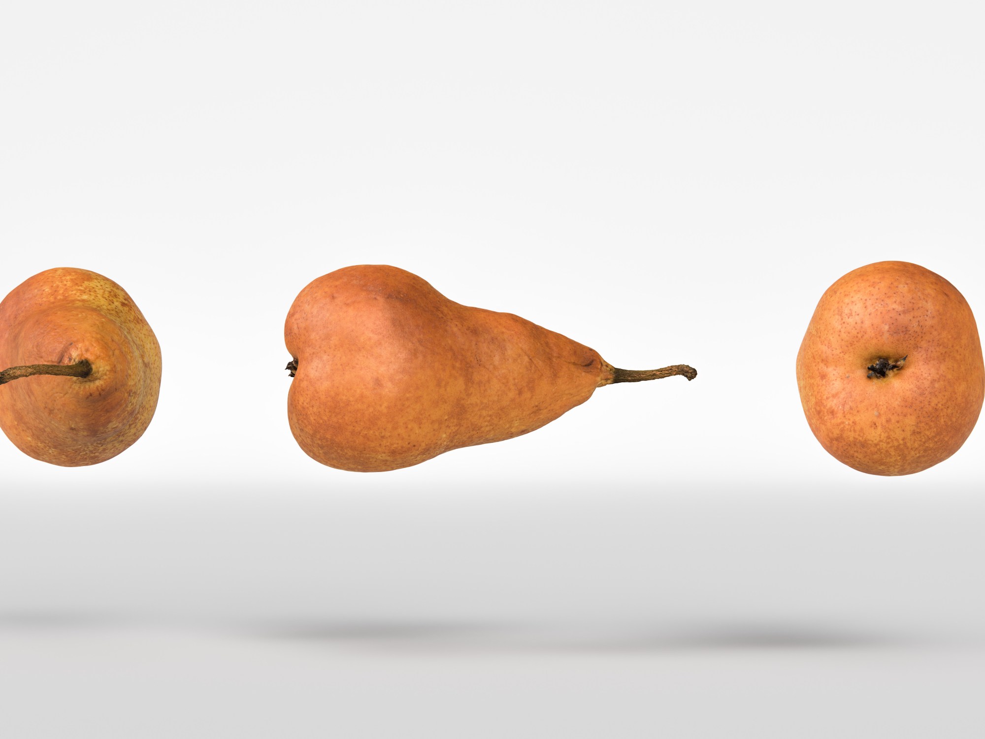 The pear model is presented as a single mesh in 3 subdivision levels: low, mid, and high. Meshes are quad based. The polycounts are 7K, 127K, and 2039K. The high-detail model is included in .max, .fbx, and .obj formats.