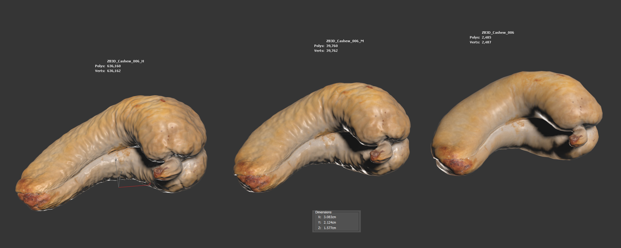 The cashew model is presented as a single mesh in 3 subdivision levels: low, mid, and high. Meshes are quad based. The polycounts are 2K, 39K, and 636K. The high-detail model is included in .max, .fbx, and .obj formats.