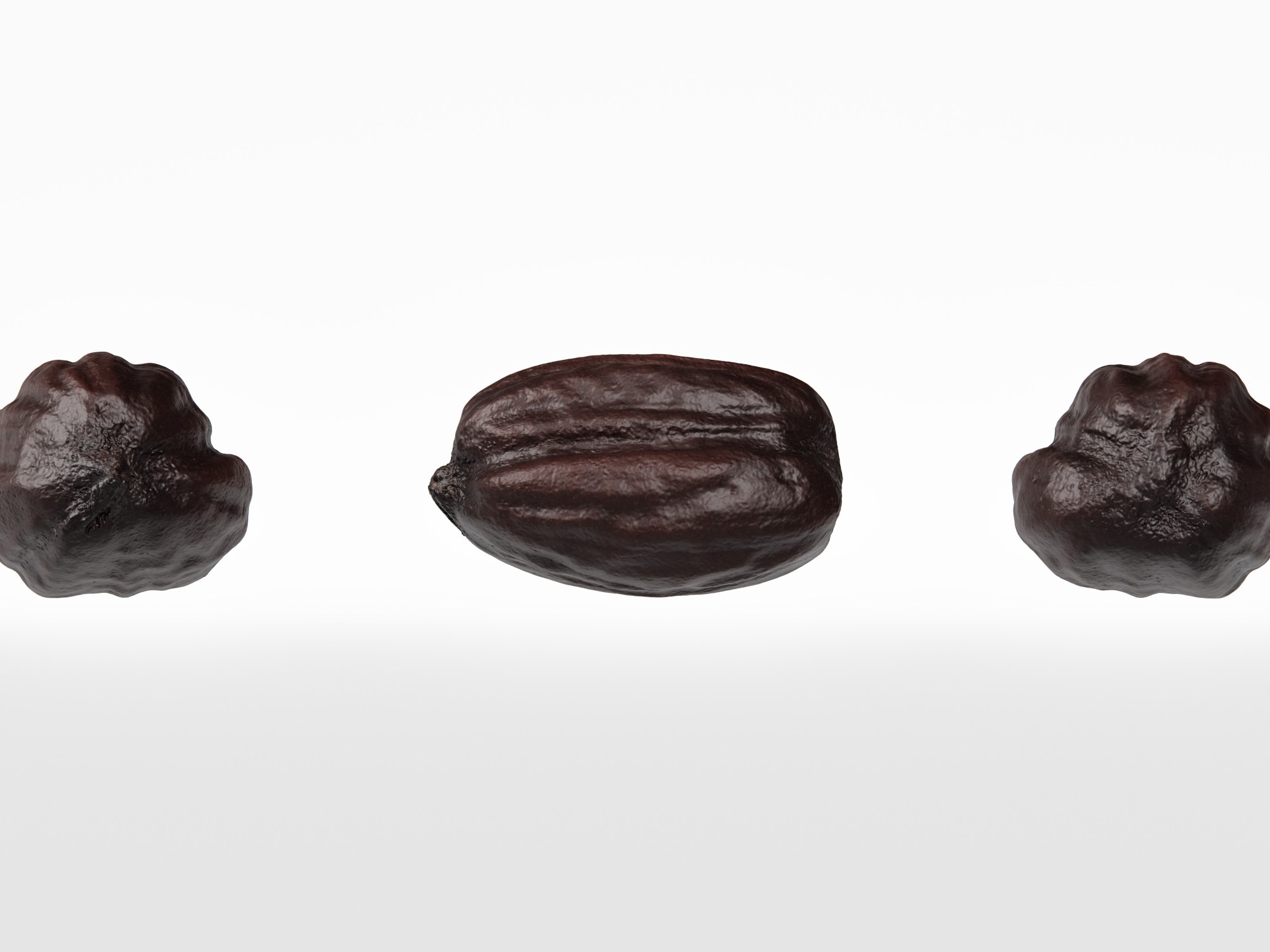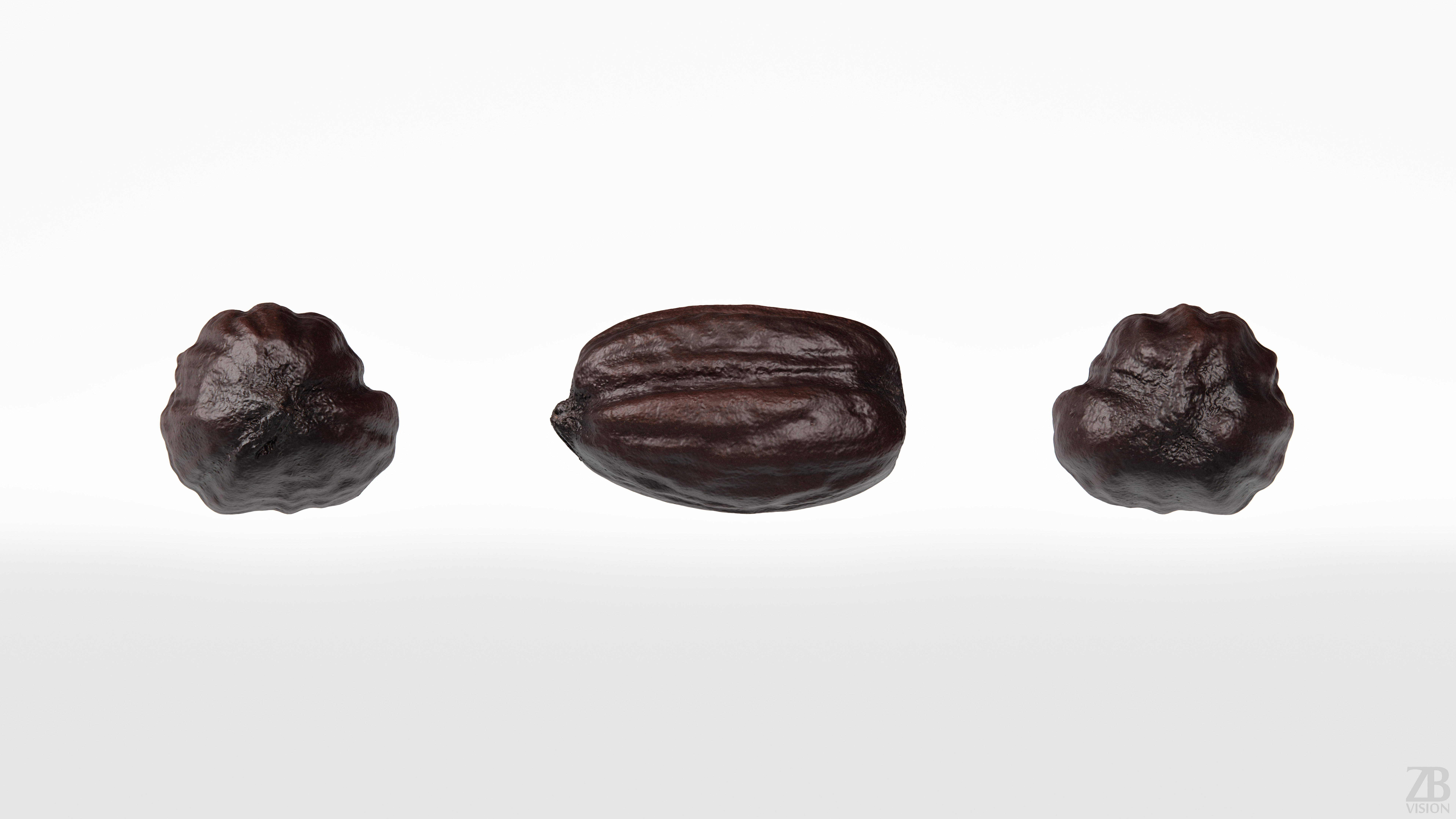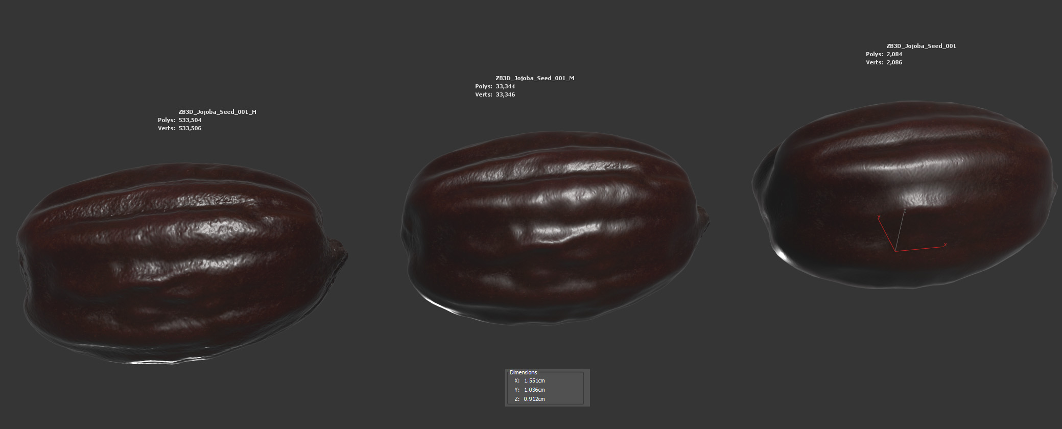 The jojoba seed model is presented as a single mesh in 3 subdivision levels: low, mid, and high. Meshes are quad based. The polycounts are 2K, 33K, and 533K. The high-detail model is included in .max, .fbx, and .obj formats.
