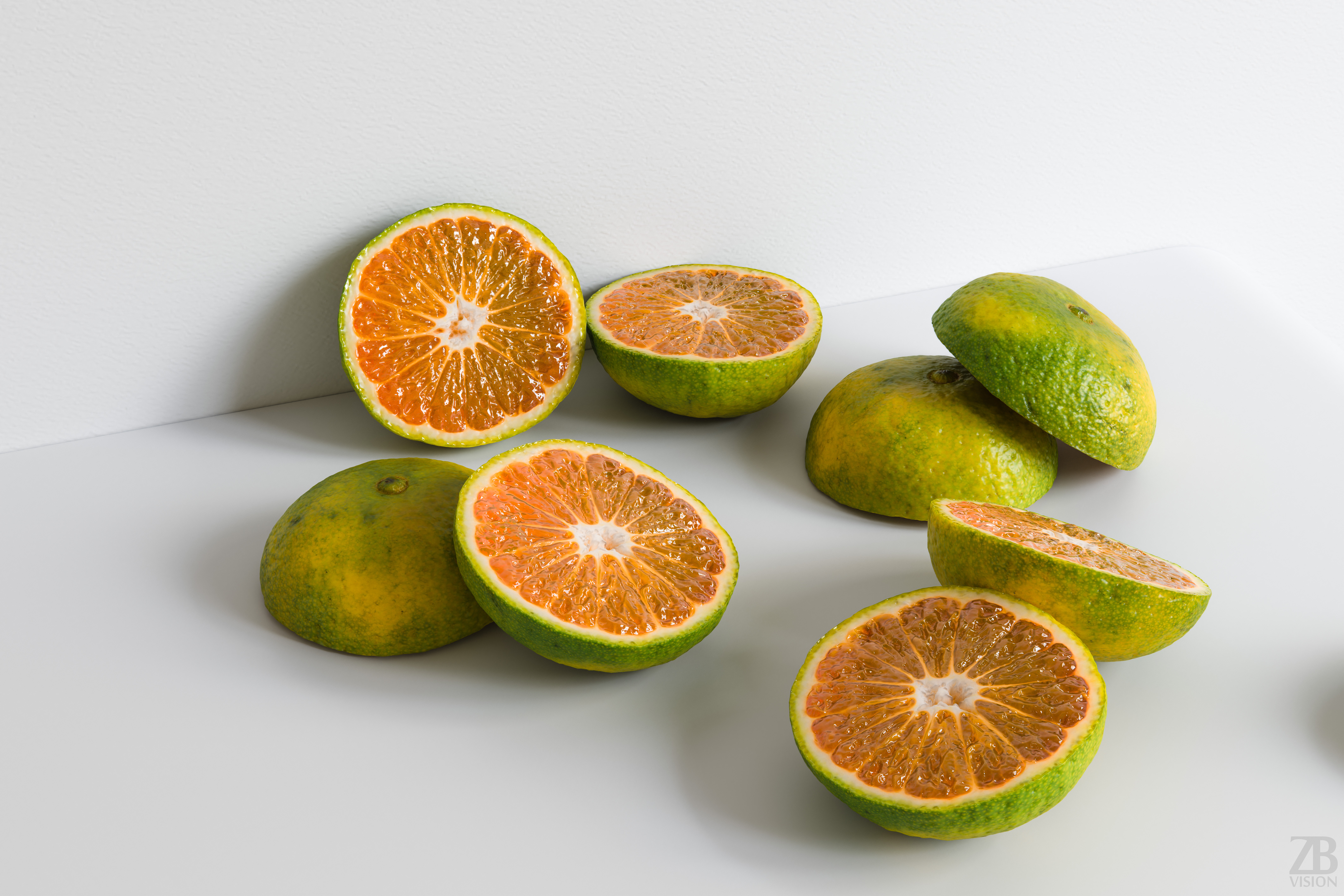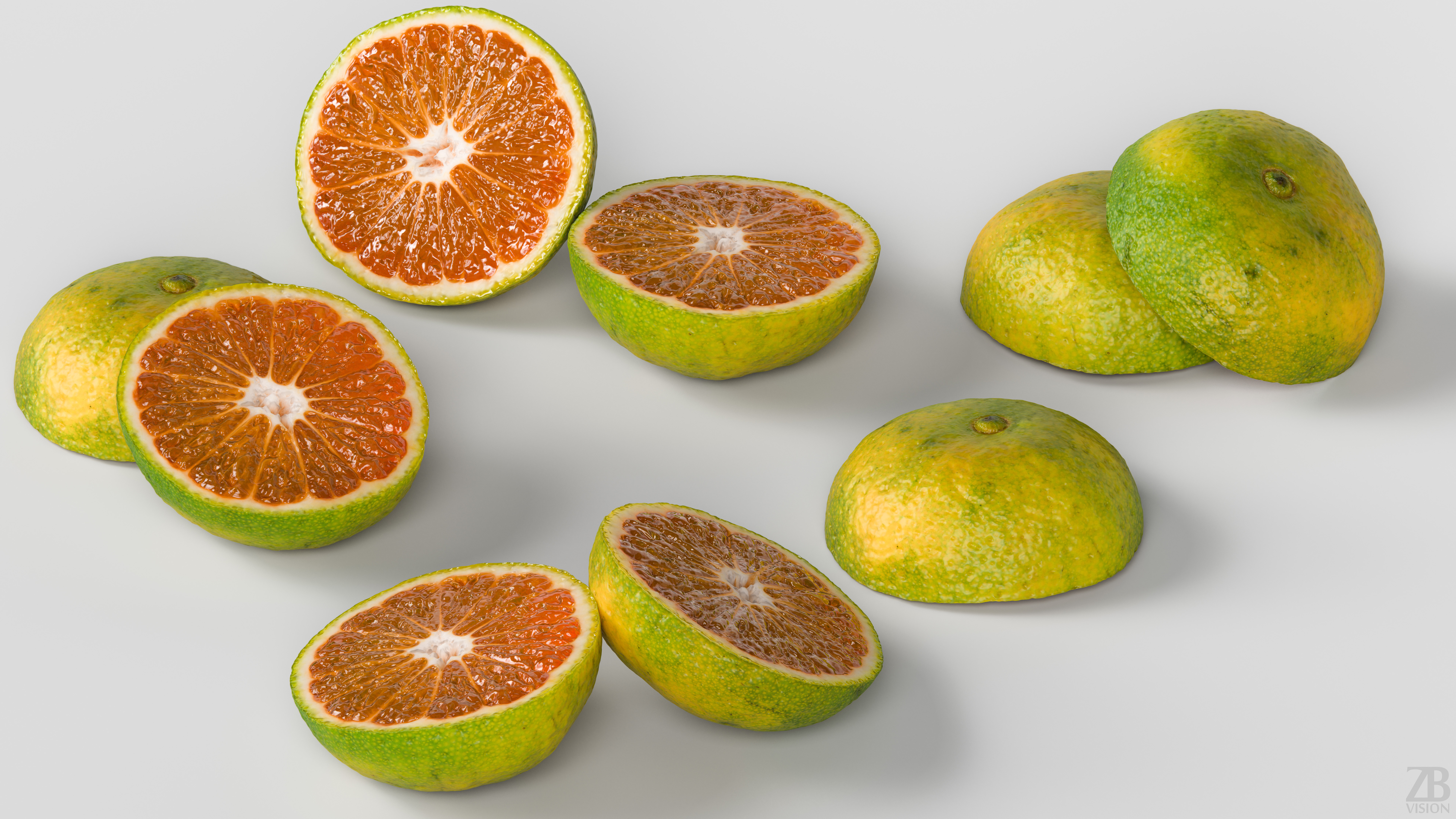 The satsuma model is presented as a single mesh in 3 subdivision levels: low, mid, and high. Meshes are quad based. The polycounts are 3K, 52K, and 843K. The high-detail model is included in .max, .fbx, and .obj formats.